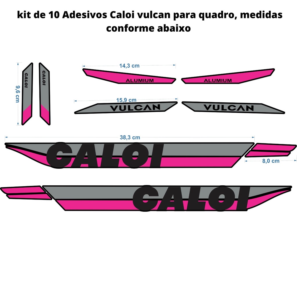 Kit adesivo para bicicleta Modelo Caloi Vulcan aro 26, 27,5 e 29 Verificar os detalhes das medidas nas imagens 2 e 3 Adesivo automotivo Imprimax, uma das melhores marcas do mercado, Extrema proteção e Longos anos de durabilidade, resistente ao sol, chuva, protege contra atrito, poeira, pedras e riscos. Compatível com todas as bicicletas do aro 20 ou maior. Detalhes das medidas de cada adesivo nas imagens do anuncio, verificar cores disponíveis na variação do anuncio Especificação Técnica: • Fabricado em adesivo vinil automotivo de ótima qualidade • Compatível com todos os modelos de quadro de aro 20 até 29 • Autocolante • Ótima Aderência e Durabilidade • Maior Praticidade na Instalação **ANTES DE INSTALAR LIMPE BEM O LOCAL DA INSTALAÇÃO COM ÁLCOOL ISOPROPÍLICO PARA UMA MELHOR ADERÊNCIA * CERTIFIQUE-SE QUE NÃO TENHA RESÍDUOS DE SUJEIRAS, SILICONE, ÓLEO E OUTROS****