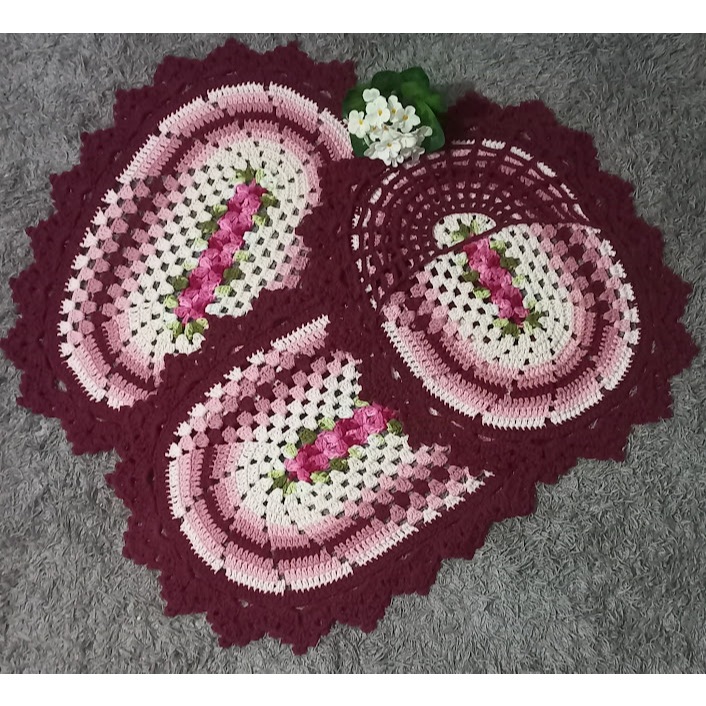 Tapetes em crochê para banheiro, feitos a mão, totalmente artesanal de ótima qualidade. Itens inclusos: 01 tapete oval para tampa do vaso 56 x 45 cm 01 tapete oval inferior vaso 60 x 45 cm 01 tapete oval 65 x 45 cm Produto 100% Artesanal, feito a mão, com material de Ótima qualidade com acabamentos perfeitos, garantindo assim a segurança e a durabilidade da peça. Fica lindo em qualquer ambiente da Casa, ótima opção para compor sua decoração. Também pode ser feito em outras combinações de cores, para mais informações entre em contato através do chat que iremos te atender. 🔊🔊 As cores podem sofrer variações devido a resolução da câmera do seu celular ou do computador, os tons de barbantes também pode variar em tonalidades para mais claras ou escuras. Tapetes em crochê fabricado em barbante, com formato Oval. Obs: -Pode ocorrer pequenas variações nas medidas devido o produto ser feito manualmente; - Posso fazer em outras cores se desejar, é só me chamar no chat. CARACTERÍSTICAS: -Material usado barbante n: 06 -85% Algodão + Outras Fibras