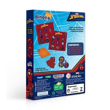 Jogo Marvel - Bingo Homem Aranha -Toyster 8017 - TOYSTER BRINQUEDOS LTDA Vamos brincar com o super bingo do Homem Aranha? É diversão garantida para toda a família brincar junto! Assim como o jogo de bingo tradicional, o jogo bingo do Homem Aranha é jogado com cartelas, mas o sorteio são de personagens. É um jogo de bingo infantil com personagens que estimula o raciocínio lógico, a atenção, a organização e a concentração das crianças. Conteúdo da Embalagem: 6 Cartelas frente e verso. 36 fichas de marcação. 27 fichas de sorteio. 1 saco plástico. Especificações: Marca: Toyster Idade: A partir de 6 anos Número de Participantes – 2 a 6 participantes
