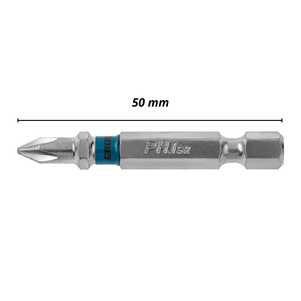 Jogo de bits da marca GROSS e projetado como jogo de bicos removíveis para ferramentas mecânicas e manuais. Bits são feitas de aço ferramenta de alta qualidade da marca S2. A dureza de bits e 58-62 HR?. A base de um bit e uma haste sextavada de 0,6 cm (1/4 de polegada) de comprimento. Comprimento de um bit e 50 mm, tipo PH3 (cruciforme). Como proteção de contrafeito cada bit tem um anel de cor com logotipo da marca GROSS. O jogo de dez bits e embalado numa caixa blister com medidas 125x85 mm.