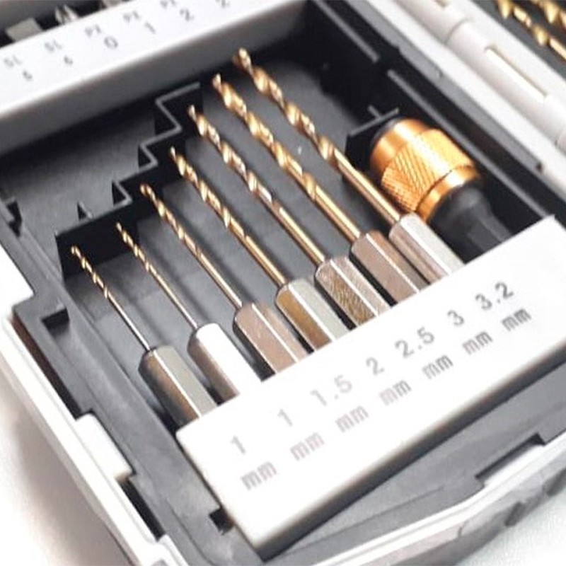 Jogo de Bits e Brocas com Adaptador Magnético 40 Peças MTX 113229 O Jogo de Bits e Brocas com Adptador Magnético é ideal para trabalhos de manutenção em geral. Composto por 40 peças, sendo: 8 Bits Phillips (25mm): PH0, PH1, PH2 (5), PH3 3 Bits Fenda (25mm): SL4, SL5, SL6 5 Bits Pozidriv (25mm): PZ0, PZ1, PZ2 (2), PZ3 8 Bits Tork (25mm): T8, T10, T15, T20, T25, T27, T30, T40 15 Brocas: 1 (2), 1.5, 2, 2.5, 3, 3.2, 3.5 (2), 4, 4.5, 4.8, 5, 5.5, 6 mm 1 Adaptador magnético Imagens Meramente Ilustrativas