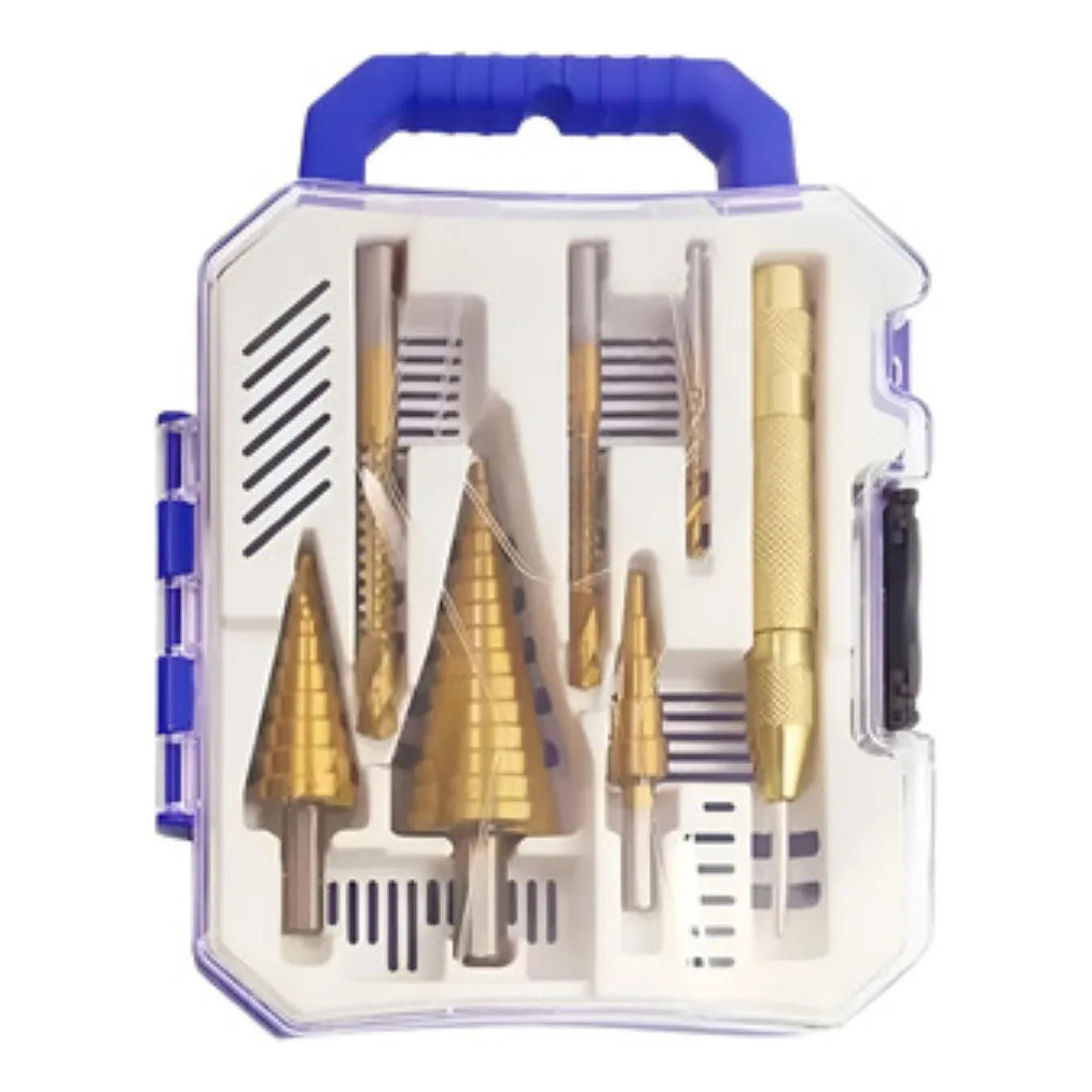 Projetado para uma perfuração eficiente, este versátil conjunto de brocas escalonadas com 7 peças é a solução ideal para suas necessidades de perfuração em uma variedade de materiais e tamanhos. Afiada, precisa e resistente, elas perfuram facilmente furos lisos e uniformes em metal, madeira e plástico. Uma broca excelente pode aprimorar todo o seu fluxo de trabalho. Kit de Brocas Escalonadas Profissional – Versatilidade e Precisão Fure de 4mm a 32mm sem Trocar de Broca! Precisa perfurar diferentes tamanhos de furos sem perder tempo trocando brocas? Este kit profissional vem com 3 brocas escalonadas (tamanhos: 4-12mm, 4-20mm e 4-32mm) para você abrir furos de 4mm até 32mm usando a mesma broca. Mais praticidade, impossível! Cada broca escalonada substitui várias brocas convencionais, economizando seu tempo e espaço na maleta. Perfura Metal, Madeira, Plástico e Muito Mais Use em vários materiais: Este conjunto é a solução tudo em um para seus projetos Kit Completo com Ferramentas Extras Este kit completo traz tudo de que você precisa para perfurações perfeitas: 3 Brocas Escalonadas (4-12mm, 4-20mm, 4-32mm) – realize furos em diversos diâmetros com apenas 3 brocas 3 Brocas de Corte Lateral (serrilhadas) de 3mm, 6mm e 8mm – ideais para alargar furos existentes ou fazer cortes laterais em materiais finos 1 Punção Central Automático – marque pontos de furo com precisão, sem esforço 1 Estojo de Armazenamento – organize e proteja todas as peças em um só lugar, facilitando o transporte
