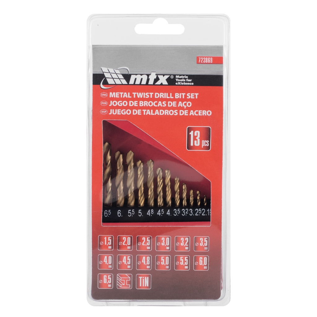 Jogo de Brocas Aço Rápido 1,5 a 6,5mm MTX para Metal com 13 Peças Descrição: - Jogo de brocas para para metal com 13 peças de 1,5 a 6,5 mm - Brocas revestidas em nitreto de titânio - Para metais ferrosos e não ferrosos - Haste cilíndrica - Armazenadas em caixa plástica. - Fabricada em aço rápido (HSS) sob a norma internacional DIN 338 - Possui acabamento brilhante - Tipo de broca mais versátil, podendo ser usada em qualquer usinagem de materiais com dureza inferiores a 45 HRC - Brocas com as medidas: 1,5 - 2,0 - 2,5 - 3,0 - 3,2 - 3,5 - 4,0 - 4,5 - 4,8 - 5,0 - 5,5 - 6,0 - 6,5 mm