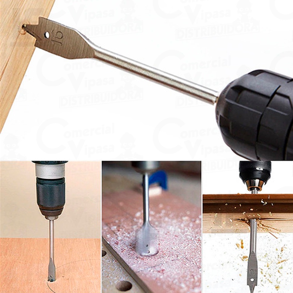 COMERCIAL VIPASA DISTRIBUIDORA. Jogo De Brocas Chatas Para Madeira Plásticos MDF Com Ponta Guia Kit Com 6 Peças :: Jogo de Brocas Chatas :: Para Madeira Kit com 6 Peças :: São adequadas para furar :: Madeiras moles, duras, compensados de pinho, de virola, aglomerados, fórmicas, :: Plásticos e fibras sintéticas. :: Possui ponta afiada que :: facilita a centralização do furo. DESCRIÇÃO GERAL: O jogo de brocas chatas para madeira, composto por 6 peças, é um conjunto de ferramentas projetado especificamente para perfurar orifícios limpos e precisos em madeira. Variedade de Tamanhos: O conjunto inclui várias brocas chatas de diferentes tamanhos, permitindo perfurar orifícios de diâmetros variados. Essa variedade proporciona versatilidade para diferentes projetos e requisitos de tamanho de furo. Pontas Afiadas: As brocas chatas têm pontas afiadas que cortam facilmente a madeira, proporcionando orifícios limpos e sem rebarbas. Isso garante uma superfície de trabalho suave e profissional. Construção Durável: As brocas geralmente são fabricadas em aço carbono de alta qualidade ou aço rápido (HSS), garantindo durabilidade e resistência ao desgaste, mesmo sob uso frequente e prolongado. Design Especializado: O design plano e largo das brocas chatas ajuda a evitar que elas escorreguem enquanto perfuram, proporcionando maior precisão e controle durante o trabalho. Compatibilidade: As brocas chatas são projetadas para serem utilizadas em furadeiras elétricas ou manuais comuns, garantindo compatibilidade com a maioria das ferramentas de perfuração disponíveis no mercado. Aplicações Versáteis: Este conjunto é ideal para uma variedade de aplicações em trabalhos de marcenaria, carpintaria, fabricação de móveis, instalação de prateleiras, montagem de estruturas de madeira e outros projetos que envolvam trabalhar com madeira. Facilidade de Identificação: Cada broca geralmente é marcada com o tamanho do diâmetro, facilitando a identificação rápida e precisa da broca necessária para cada aplicação. O jogo de brocas chatas para madeira com 6 peças é uma escolha essencial para qualquer pessoa envolvida em trabalhos de carpintaria ou marcenaria, oferecendo versatilidade, durabilidade e desempenho consistente para uma variedade de projetos. COMERCIAL VIPASA DISTRIBUIDORA.