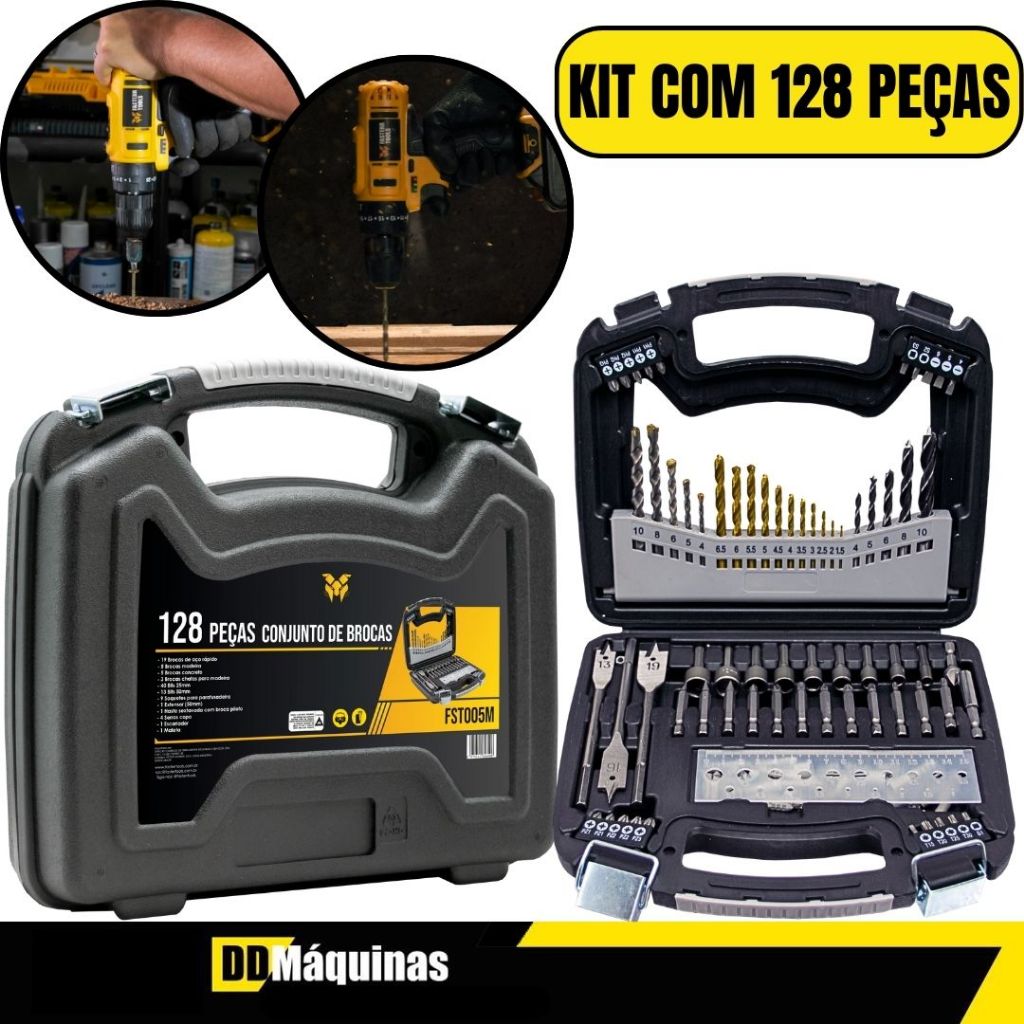 JOGO DE BROCAS TITANIO 128PCS FASTERR FST005Na hora de realizar os reparos rotineiros em nossa casa, contar com os acessórios corretos pode fazer toda diferença não é mesmo? Por isso vale a pena conferir o Jogo de Brocas. Trata-se de um jogo de soquetes indicado pra os mais diversos reparos domésticos, com variados tamanhos e encaixes, além de outros acessórios totalizando 128 peças. Ele é ideal para os mais diversos trabalhos e reparos residenciais, ajudando a deixar o seu dia a dia muito mais prático. Além de tudo isso, acompanha maleta para armazenagem e transporte facilitando ainda mais seu dia a dia.ITENS INCLUSOS:• 11 Brocas HSS (1.5, 2.0, 2.5, 3.0, 3.5, 4.0, 4.5, 5.0, 5.5, 6.0, 6.5mm)• 5 Brocas para madeira (4.0, 5.0, 6.0, 8.0, 10mm)• 5 Brocas para alvenaria (4.0, 5.0, 6.0, 7.0, 8.0, 10mm)• 3 Brocas chatas para madeira (13, 16, 19, 22mm) - 20 Pcs - 25mmChave de fenda BIT CRV-6150, sendo:• 3 Bit fenda: 4, 5, 6mm• 5 Bit phillips: #1*2, #2*2, #3 - 5 Bit pozidriv: #1*2, #2*2, #3 - 3 Bit quadrado: S1, S2, S3• 4 Bit Estrela: T15, T20, T25, T30 - 12PCS-50mmChave de fenda BIT CRV-6150, sendo:• 3 Bit fenda: 4, 5, 6mm• 3 Bit Phillips: #1, #2, #3• 3 Bit pozidriv: #1, #2, #3• 3 Bit Estrela: T15, T20, T25• 9 Chaves de porca: 40CR, 5, 6, 7, 8, 9, 10, 11, 12, 13mm• 1 Suporte de Bid• 1 Maleta• 1 Régua de plástico• 60 Plugues de parede: 5mm, 6mm, 8mm, 10mmTERMOS DE COMPRA1 - Entrega via Shopee por transportadora.2 - Prazo de Postagem é de até 48hs, validos apenas para dias úteis após a compra.3 - O prazo de entrega informado no ato da compra é apenas um prazo estimado e não leva em consideração o prazo de postagem (item 2), podendo haver atrasos por parte da transportadora.O prazo de entrega informado é feito pela Transportadora da Shopee e não por nós. Faça o acompanhamento da sua compra para se certificar que nós postamos o seu produto no prazo informado no item 2.4 - Todas as imagens são meramente ilustrativas;5 - Caso o endereço esteja incorreto, o produto irá voltar e o pagamento será devolvido.6 - É importante que se for necessário escolher alguma variação, escolha o Tamanho/ Modelo / Cor / Voltagem imediatamente7- Todos os produtos são originais e acompanham nota fiscal.Garantia de 90 dias pelo fabricanteImagens meramente ilustrativas