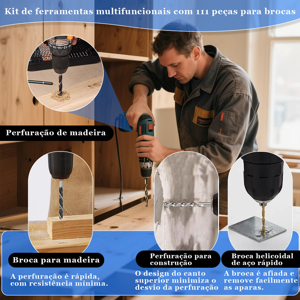 Kit Pontas Brocas 110 Peças Este kit é uma combinação de ferramentas eficiente, contendo 110 peças que abrangem diversas aplicações como perfuração, fixação de parafusos e trabalhos em madeira, atendendo a necessidades variadas de trabalho. Acompanhada de uma maleta para organização e praticidade, facilitando o seu descolamento, caso seja necessário utilizar as demais peças do conjunto. Acompanha: (1) 13 BROCAS DE HSS: 1,5, 2, 2,5, 3, 3,2, 3,5, 4, 4,5, 4,8, 5, 5,5, 6, 6,5 mm (2) 6 BROCAS PARA ALVENARIA COM PONTA DE CARBONETO: 4, 5, 6, 7, 8, 10 mm (3) 6 BROCAS PARA MADEIRA: 4, 5, 6, 7, 8, 10 mm (4) 3 BROCAS PARA MADEIRA CHATA: 13, 16, 19 mm (5) 13 BROCAS PARA PARAFUSAR DE 50 mm FENDADA: 4, 5, 6, PHILLIPS: #0, #1, #2, #3; POZI: PZ1, PZ2, PZ3 ESTRELA: T10, T15, T20, (6) CHAVE DE FENDA DE 50-25MM BROCAS COM RANHURA: 3X4, 4X4, 5X4, 6X4, 7X4; PHILLIPS: #1X2, #2X2, #3X1; POZ:PZ,P22, P23STAR:T10,T1S,T20,T25,T27, T30ROBERTSON:S1,S2, S3HEX:3X2,4X3,5X3,6X3,7X2 (7) 1-PORTA-BIT MAGNÉTICO (8) 10-CHAVES DE PORCA: 5, 5,5, 6, 7, 8, 9, 10, 11, 12, 13MM (9) 1-Chave de fenda com catraca (10) 1-BANCADA NA PIA (11) 2-BUCHAS DE PARAFUSO (12) 4-SERRAS COPO COM ADAPTADOR DE SERRA COPO: 32, 38, 45 e 54MM Modelo:Kit de brocas múltiplas com 110 peças Dimensões do item(A x L x C): 6 x 21 x 30cm Seja para reparos domésticos, trabalhos de marcenaria ou projetos de construção profissional, este kit oferece suporte com ferramentas eficientes e precisas, sendo um auxiliar indispensável! Garantia do vendedor: 90 dias
