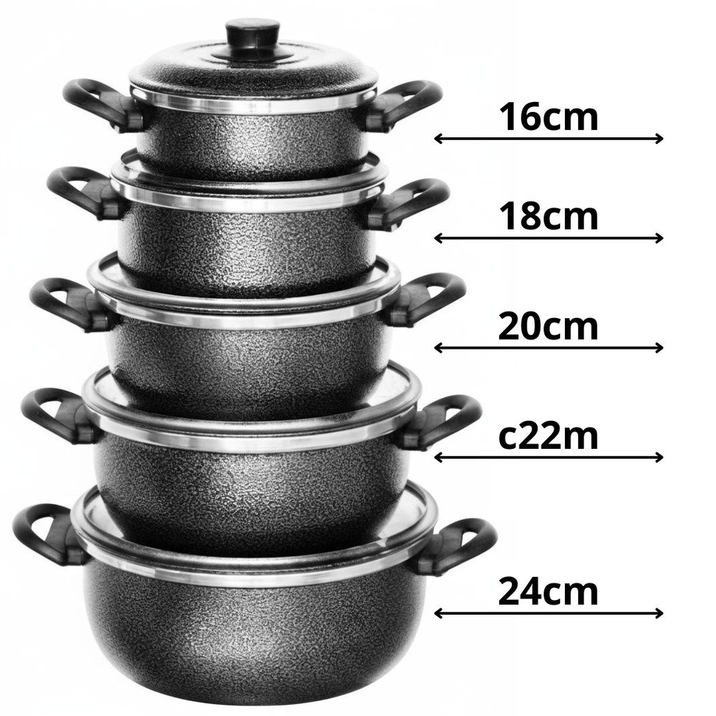 O Jogo de panelas com 5 panelas Craquelado é feito em alumínio polido com acabamento de altíssima qualidade. Além disso, os cabos fabricados em baquelite antitérmico garantem segurança e conforto durante o uso, permitindo que você manipule as panelas sem se queimar. Este jogo de panelas é perfeito para qualquer cozinha e irá ajudá-lo a preparar pratos deliciosos com facilidade. ESPECIFICAÇÕES - Composta por 5 caçarolas Craquelado- Acabamento em alumínio polido Craqueado- mais praticidade para você! - Material: corpo em alumínio, cabos e puxadores em baquelite antitérmico 01 Caçarola com alças e tampa, diâmetro 22,5cm; Altura 11cm; 01 Caçarola com alças e tampa, diâmetro 20cm; Altura 9,5cm; 01 Caçarola com alças e tampa, diâmetro 18cm; Altura 8,5cm; 01 Caçarola com alças e tampa, diâmetro 16cm; Altura 8cm; 01 Caçarola com alças e tampa, diâmetro 14cm; Altura 7,cm: Quaisquer dúvidas estamos à disposição no chat!