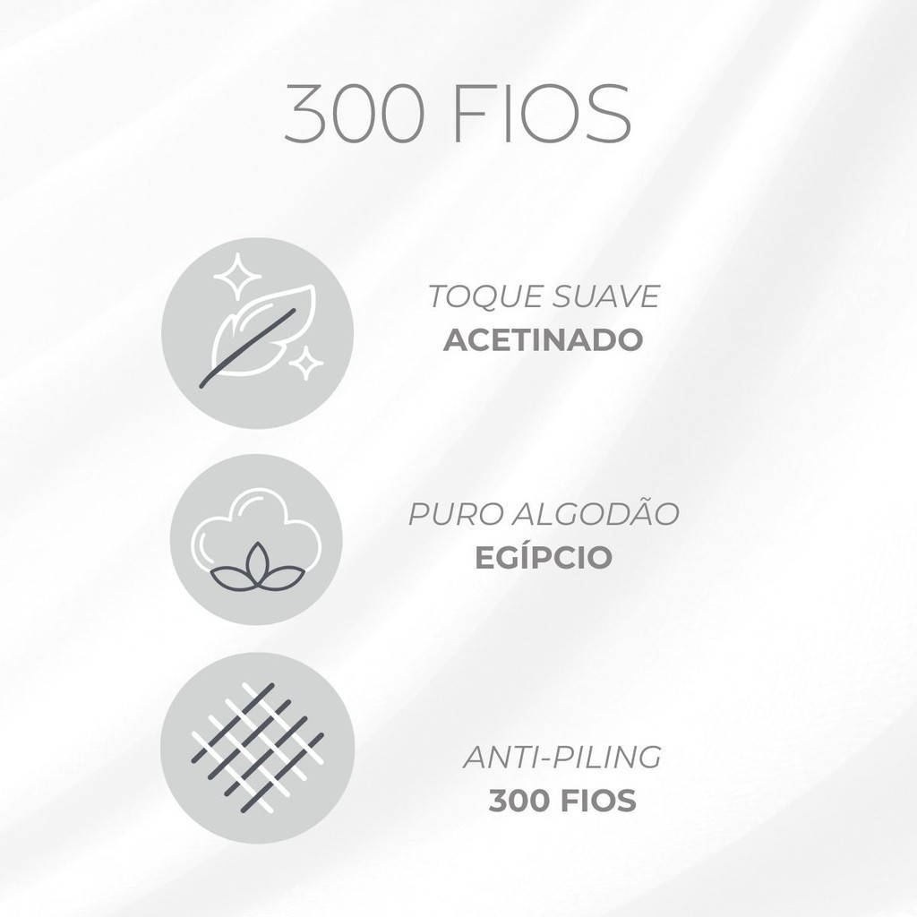 O Jogo de Cama 300 Fios Satinée da Kacyumara é ideal para quem busca uma cama posta elegante, confortável e com acabamento impecável, elevando a experiência do quarto com sofisticação e bem-estar. Confeccionado em 100% algodão egípcio 300 fios, oferece toque suave acetinado, maciez superior e excelente respirabilidade. Seu tecido conta com tratamento antipilling, garantindo maior durabilidade e mantendo o visual bonito por muito mais tempo, sem formação de bolinhas. O lençol com elástico proporciona ajuste perfeito ao colchão, com caimento firme e alinhado, contribuindo para uma cama sempre organizada e com visual de hotelaria em casa. Um conjunto pensado para quem valoriza conforto, estética e qualidade no enxoval. Diferenciais do produto Tecido 300 fios com toque suave acetinado 100% algodão egípcio Tratamento antipilling para maior durabilidade Caimento elegante e ajuste perfeito ao colchão Ideal para cama posta sofisticada Conforto superior para uso diário Qualidade e tradição Kacyumara Conteúdo da embalagem (conforme tamanho escolhido) Solteiro 1 Lençol com elástico 1 Lençol com vira 1 Fronha 50 x 70 cm Casal / Queen / King 1 Lençol com elástico 1 Lençol com vira 2 Fronhas 50 x 70 cm Medidas Lençol com elástico Solteiro: 0,98 x 2,03 x 0,40 m Casal: 1,40 x 1,90 x 0,40 m Queen: 1,60 x 2,00 x 0,45 m King: 1,93 x 2,03 x 0,45 m Lençol com vira Solteiro: 1,80 x 2,60 m Casal: 2,20 x 2,60 m Queen: 2,40 x 2,60 m King: 2,80 x 2,60 m Fronhas 50 x 70 cm Solteiro: 1 unidade Casal, Queen e King: 2 unidades Composição 100% Algodão Egípcio 300 Fios Cuidados Lavar à máquina em modo suave, sem excesso de peso Não misturar cores, principalmente escuras Não deixar de molho Não usar cloro Não secar em tambor Secar à sombra Não passar Utilizar sabão neutro e seguir as instruções da etiqueta Informações importantes As cores do produto podem apresentar variações sutis de acordo com o lote de fabricação e/ou configurações de tela.