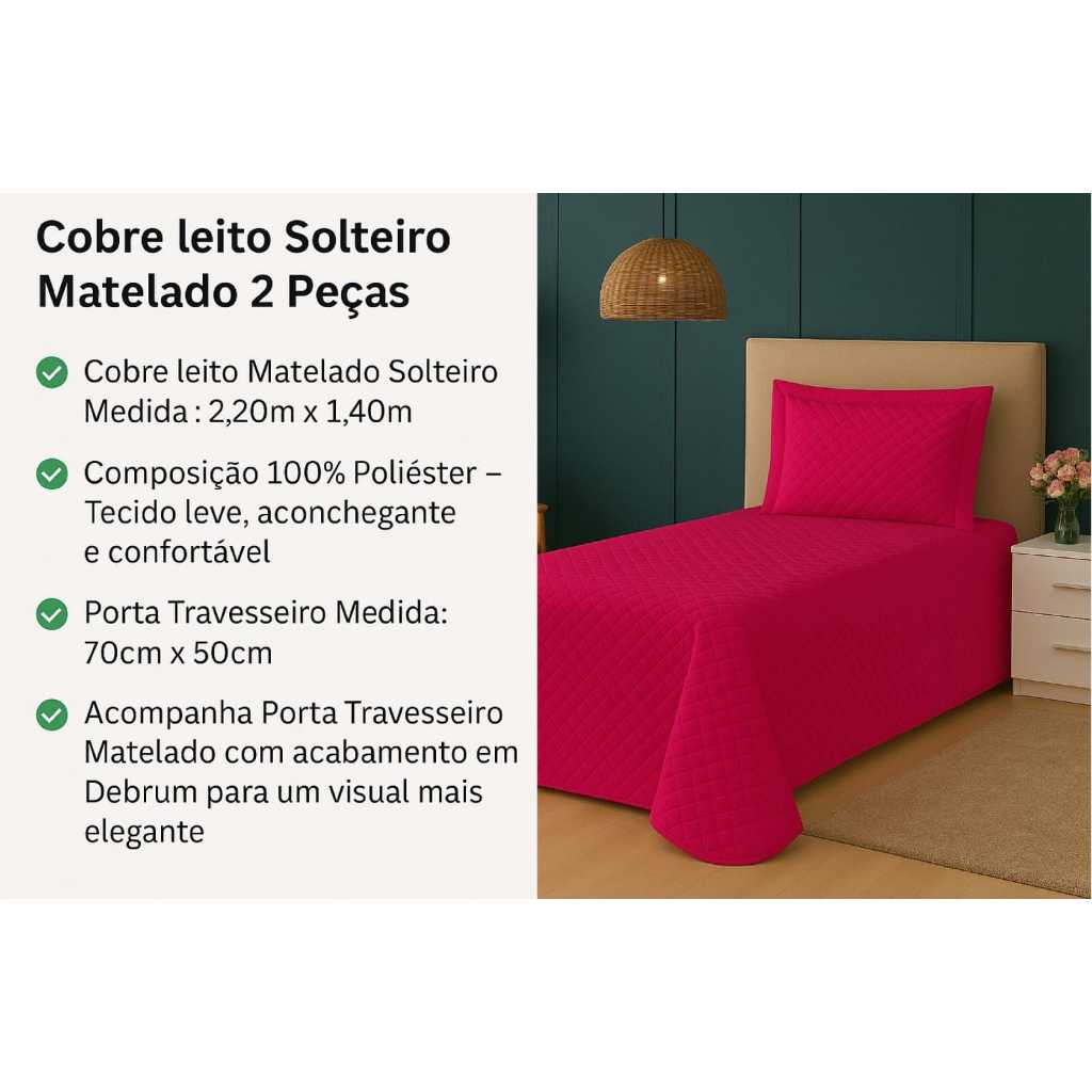 Este lindo Kit Cobre-leito Matelado Solteiro 2 peças é fabricado em 100% Poliéster e Microfibra de alta qualidade proporcionam mais conforto, aconchego e maciez ao produto. Muita beleza e sofisticação ao ambiente . O produto encaixa-se perfeitamente com qualquer tipo de decoração. O cobre-leito não apenas adiciona estilo e elegância ao seu quarto, mas também oferece funcionalidade ao proteger seu colchão, facilitar a limpeza e proporcionar conforto adicional, tornando-o uma adição valiosa ao seu ambiente de dormir. Acompanha Porta Travesseiro Matelado que é peça essencial no dia a dia, além de protegerem o seu travesseiro, são indispensáveis para dar aquela decoração especial com acabamento em Debrum. CONTÉM NA EMBALAGEM : 1 -Cobre-Leito Matelado Liso 1 - Porta Travesseiro Matelado Liso ----------TOTALIZANDO ASSIM 2 PEÇAS---------- - MEDIDAS DO COBRE-LEITO: Cobre-Leito: 2,20m X 1,40m Porta Travesseiro: 70cm X 50cm COBRE-LEITO - TAMANHO: Solteiro - Matelassê Ultrassônico *****ATENÇÃO***** Atentem-se à escolha das cores ANTES de efetuar a compra, será enviado exatamente a cor escolhida no leque de variações que temos cadastrado no anúncio. *******************ENVIO IMEDIATO******************** COMPOSIÇÃO DO COBRE-LEITO: - NOME DO TECIDO DE CIMA: Micro-Fibra 170 Fios - NOME DO TECIDO DE BAIXO: T.N.T. - COMPOSIÇÃO: 100% Poliéster ******** PRODUTO A PONTA ENTREGA. ********* Destaques: -Toque macio e agradável -Ajuste perfeito ao colchão -Secagem rápida -Ideal para o uso diário -Dispensa Passar Para preservar a qualidade durabilidade do seu Cobre leito siga as orientações abaixo: *Lave à máquina em ciclo suave, com água fria ou morna; *Use sabão neutro e evite o excesso de produto; *Separe por cores: lave peças claras e escuras separadamente para evitar manchas; *Evite o uso de alvejantes com cloro, pois podem danificar as fibras; *Não use amaciante em excesso, pois pode reduzir a absorção e o toque macio natural da microfibra; *Secagem em varal à sombra é ideal. *Não passe com ferro quente – normalmente, não há necessidade, pois a microfibra não amassa com facilidade. Produto de ótima qualidade e acabamento confira!!! Com selo de qualidade Uni Art Enxovais. Envio imediato. Para qualquer dúvida, entre em contato conosco pelo campo de perguntas. Será um prazer atendê-lo (a) ! Desde já agradecemos a preferência.