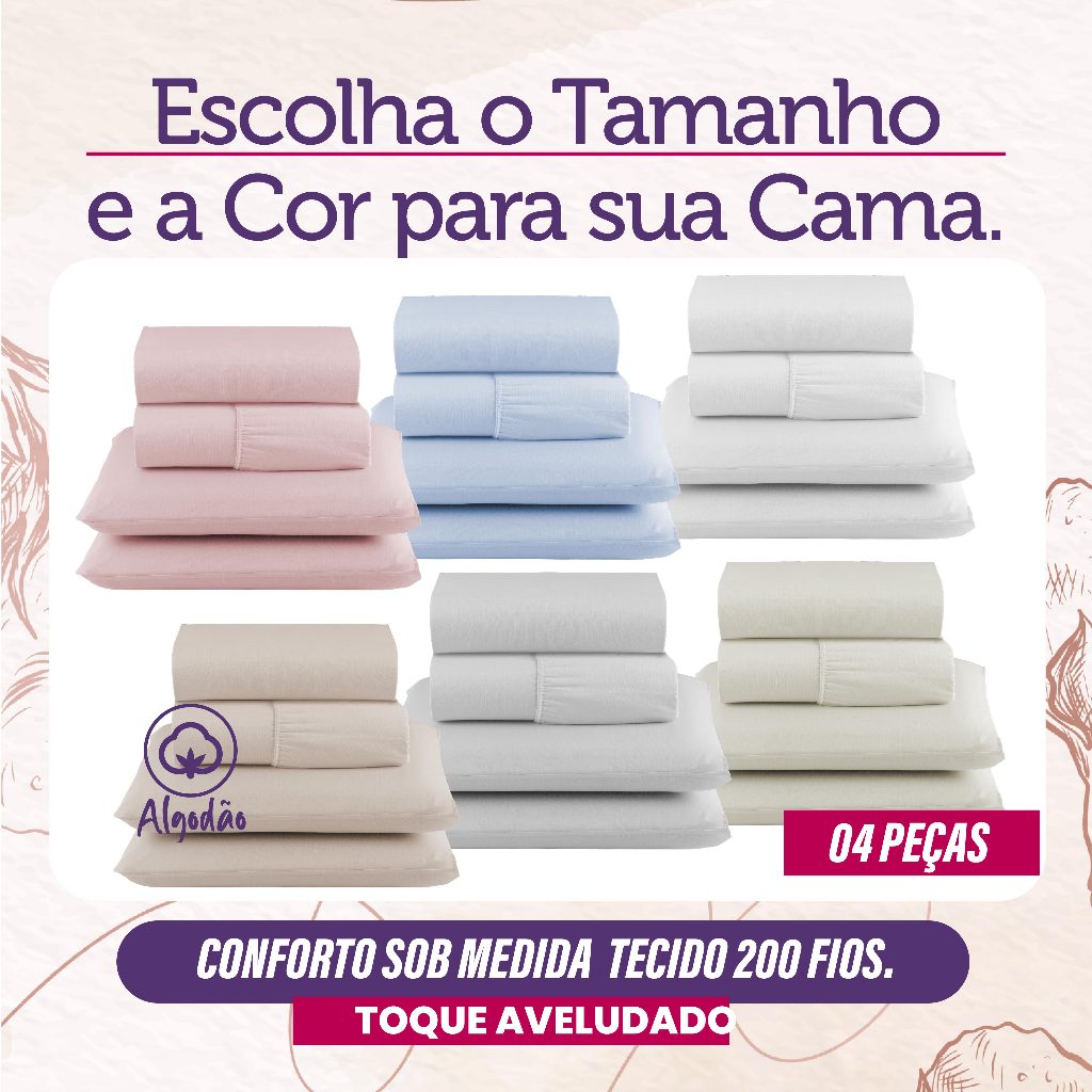 🛏️ Jogo de Lençol King 200 Fios 100% Algodão – 4 Peças Leve ainda mais conforto e sofisticação para o seu quarto com o nosso jogo de cama King 200 fios em algodão puro. Com tecido de alta qualidade, ele proporciona toque macio, frescor e durabilidade, ideal para noites de sono tranquilas e revigorantes. ✨ Características do Produto: Material: 100% Algodão – 200 fios (suave, respirável e resistente) Tamanho: King – 4 peças • 01 Lençol de baixo com elástico (encaixe perfeito em colchões King) 2,03x1,93x30 • 01 Lençol de Cima com Bainha 2,60x2,50 • 02 Fronhas macias e confortáveis 70x50 Cores disponíveis: Azul, Branco, Palha, Caqui, Cinza e Rosé Benefícios: Conforto térmico, fácil de lavar, tecido resistente e que mantém a qualidade mesmo após várias lavagens. 🌙 O jogo de lençol King 200 fios é perfeito para quem valoriza conforto, elegância e praticidade. Com cores modernas e versáteis, combina facilmente com qualquer estilo de quarto, tornando o ambiente mais sofisticado e acolhedor. 💤 Adquira já o seu e aproveite noites de sono únicas com a maciez e a qualidade incomparável do algodão natural!