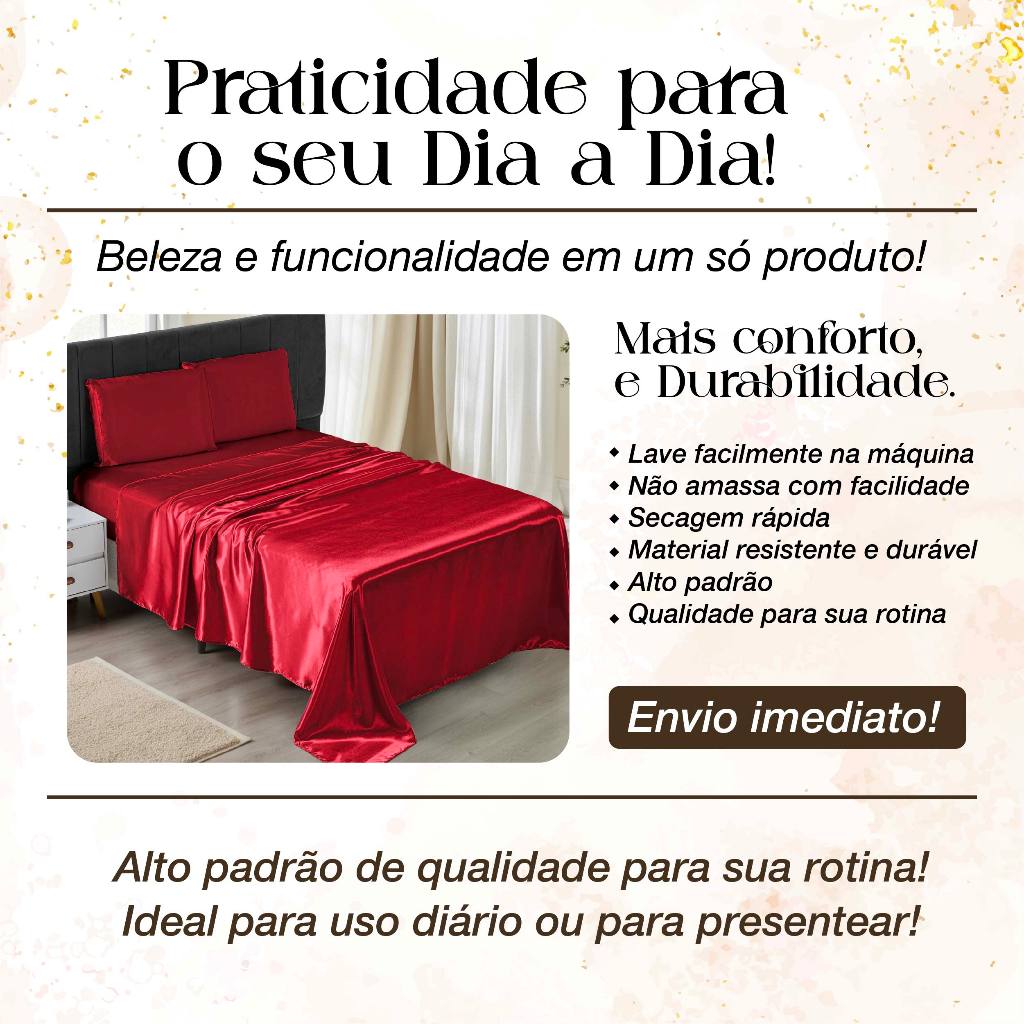 | Jogo de Cama Lençol e Fronha 04 Peças Cetim Casal Padrão Antifrizz... este produto | R$ 72,68 | 25% | 4.9/5 | 26 |