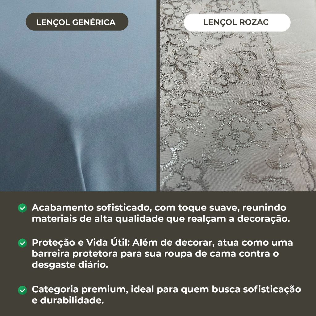 Jogo de Lençol Queen Golden Bordado Inglês Rozac 200 Fios 🛏️ O Jogo de Lençol Golden Bordado Inglês Rozac foi desenvolvido para oferecer conforto, elegância e praticidade no dia a dia. Produzido em Hipercal 200 fios com toque de algodão, proporciona uma sensação macia e agradável ao contato com a pele. O tecido conta com tecnologia antipilling, que ajuda a evitar a formação de bolinhas e mantém o lençol com aparência de novo por muito mais tempo. O bordado inglês adiciona um toque sofisticado à cama, deixando o quarto mais bonito, elegante e aconchegante. Além disso, oferece praticidade no uso diário: não precisa passar, possui secagem rápida e alta resistência ao desbotamento, facilitando o cuidado após as lavagens. Principais Benefícios • Toque macio semelhante ao algodão • Tecido Hipercal 200 fios • Tecnologia antipilling • Não precisa passar • Secagem rápida • Resistente ao desbotamento • Bordado inglês elegante • Alta durabilidade Especificações Tamanho: Queen Medida para colchão: 1,58 m x 1,98 m Altura do colchão: até 30 cm Composição: 100% poliéster Acabamento: Bordado inglês FAQ O lençol faz bolinhas? Não. Possui tecnologia antipilling, que reduz a formação de bolinhas mesmo após várias lavagens. Precisa passar? Não. O tecido amassa menos e facilita o uso no dia a dia. Desbota com o tempo? Não. O material possui boa resistência ao desbotamento, mantendo as cores bonitas por mais tempo. Serve para colchão queen alto? Sim. Indicado para colchões queen de até 30 cm de altura. Tags #jogodelençolqueen #lençolqueen #roupadecamaqueen #roupadecama #lençol200fios #lençolbordado #bordadoingles #lençolmacio #lençoltoquealgodao #lençolconfortavel #lençolantipilling #lençolnaoprecisapassar #lençolsecagemrapida #lençolpremium #enxovaldecama