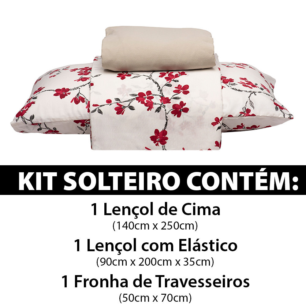Jogo de Cama Solteiro 3 peças Lençol com Elástico 100% Algodão Percal 130 Fios 90x200x35cm - Dohler