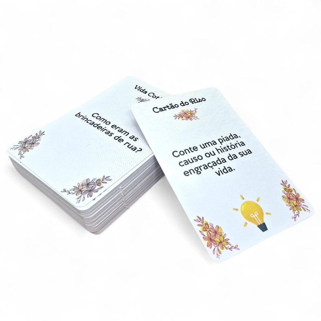 Hora Memória – Um jogo para exercitar a mente e despertar lembranças! Mantenha sua mente ativa enquanto se diverte! Hora da Memória é uma brincadeira lúdica especialmente criada para quem quer estimular a memória, a criatividade e a imaginação de forma leve e prazerosa. Com cartas cheias de encanto, o jogo desafia você contar a sua histórias de vida, despertando lembranças e fortalecendo o raciocínio. Cada rodada é uma nova oportunidade de exercitar o cérebro, dar boas risadas e compartilhar momentos especiais com amigos e família. Benefícios: Estimula a memória e a concentração; Incentiva a criação de histórias e a imaginação; Promove a socialização e o bem-estar emocional; Estimula o diálogo e reforça o sentimento de pertencimento; Fácil de levar em todos os lugares; Ideal para pessoas com mais de 50 anos que buscam manter a mente ativa e saudável. Simples, divertido e encantador, o Hora da Memória é mais do que um jogo — é uma experiência de conexão e descoberta. DICAS DE USO: Retire uma carta por vez e compartilhe uma lembrança Use em encontros familiares ou com amigos para celebrar histórias ESPECIFICAÇÕES: Idade recomendada: A partir de +50 anos Quantidade de jogadores: 2 ou 4 Tempo de jogo: 15 a 25 minutos Tipo de jogo: Cartas, memórias, desenvolvimento emocional