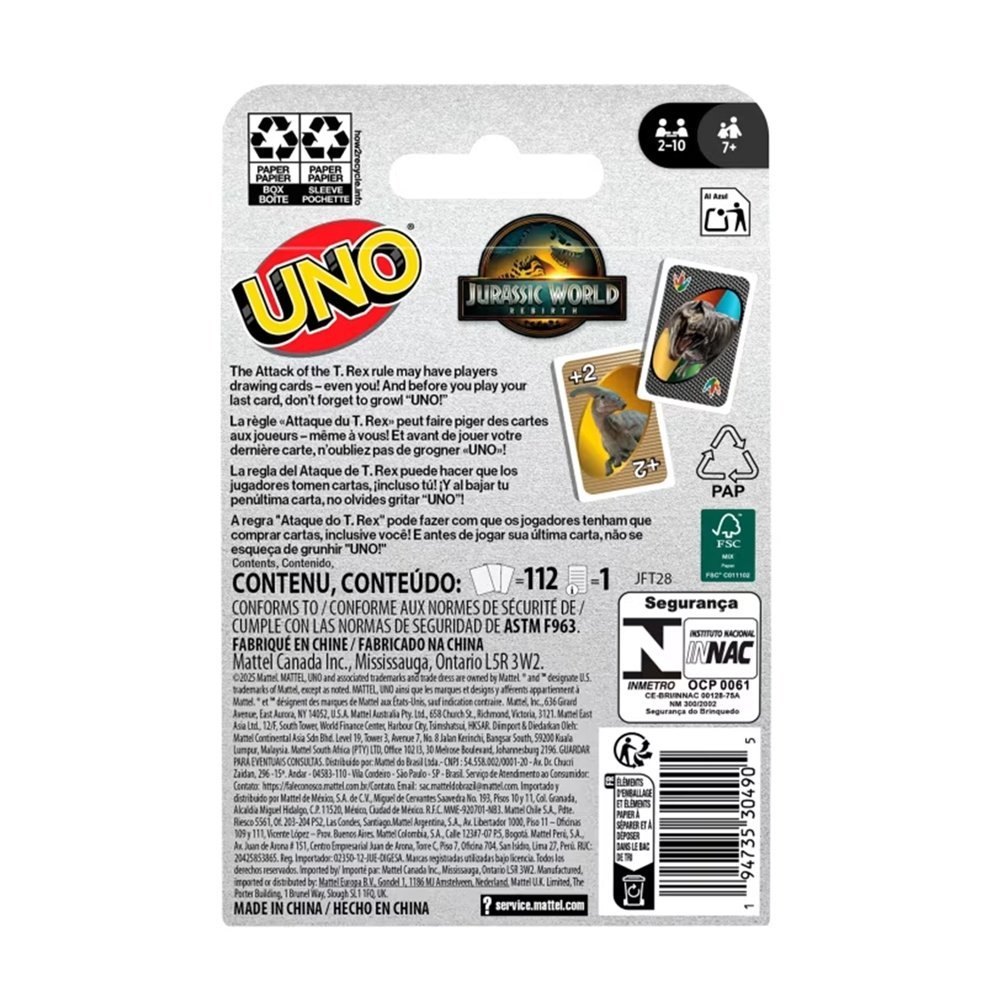 Características do Produto: Marca: Mattel Idade: 7 anos EAN: 194735304905 Características Adicionais: Ótimo presente para fãs da franquia Jurassic World Para 2 a 10 jogadores, a partir dos 7 anos de idade Quando restar apenas uma carta, não se esqueça de "rosnar": ¿UNO!¿ Existe uma regra especial chamada ¿Ataque do T. Rex¿, que faz um dos jogadores comprar cinco cartas A dinâmica segue a do UNO clássico, onde os jogadores combinam cores e números para se livrarem de todas as cartas Com um baralho com artes inspiradas nos personagens e cenas favoritas do filme, os jogadores devem combinar cores e números O jogo UNO que todos conhecem e adoram, agora vem com artes inspiradas nos personagens do filme "Jurassic World: Rebirth" Advertências: Cores e decorações podem variar Indicado a partir dos 7 anos de idade Acessórios: 112 cartas 1 instrução 1 carta metalizada colecionável Fornecedor: Mattel Do Brasil Ltda