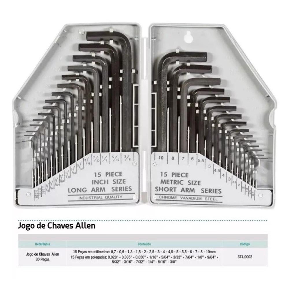 Jogo de Chaves Allen Noll com 30 peças - Conjunto composto por: 30 Peças em Cromo Vanadium - 15 peças em milímetros serie curta: 0,7 - 0,9 - 1,3 - 1,5 - 2 - 2,5 - 3 - 4 - 4,5 - 5 - 5,5 - 6 - 7 - 8 - 10mm - 15 peças em polegadas serie longa: 0,028" - 0,035" - 0,050" - 1/16" - 5/64" - 3/32" - 7/64" - 1/8" - 9/64" - 5/32" - 3/16" - 7/32" - 1/4" - 5/16" - 3/8"