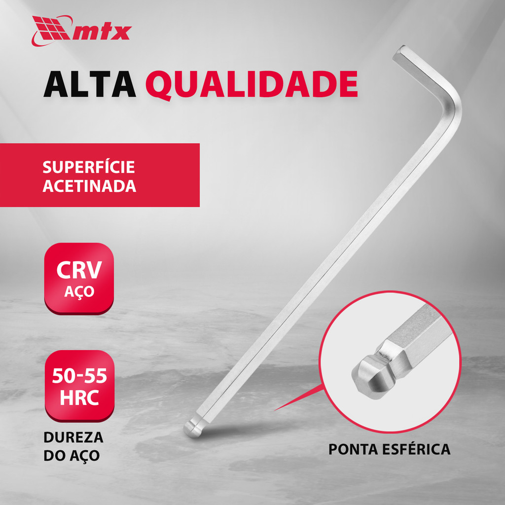 Conjunto de Chaves de Fenda Hexagonais Extra Longas com Bola MTX 164109: Precisão e Acesso Facilitado em Cada Tarefa Apresentando o Conjunto de 9 Chaves de Fenda Hexagonais Extra Longas MTX 164109, com ponta de bola e acabamento acetinado, uma inovação em ferramentas de montagem e desmontagem. Fabricadas com o robusto aço CrV e projetadas para trabalhar com parafusos de hexágono interno HEX de 1,5 a 10 mm, este conjunto é a solução perfeita para montagem de móveis, reparo de bicicletas e uma variedade de outras tarefas que exigem precisão e facilidade de acesso. Principais Vantagens: Confiabilidade e Durabilidade Asseguradas: Cada chave deste conjunto é forjada em aço cromo-vanádio de alta resistência, com uma dureza de 50-55 HRC, garantindo uma longevidade excepcional e capacidade de suportar cargas de trabalho pesadas sem deformação ou quebra. Funcionalidade Aprimorada com Ponta de Bola: As pontas em forma de bola são uma característica distintiva que permite o engate e desengate de fixadores em ângulos de até 25 graus. Esta funcionalidade aumenta significativamente a flexibilidade de uso, tornando o conjunto ideal para trabalhar em espaços confinados ou em ângulos complicados, onde o acesso direto é limitado. Versatilidade para Todos os Projetos: Com 9 tamanhos diferentes de chaves, este conjunto abrange uma ampla gama de necessidades de fixação, desde as mais minúsculas até as de maior tamanho. Essa versatilidade assegura que você tenha sempre a ferramenta certa à mão para qualquer tipo de parafuso HEX. Conforto e Facilidade de Uso: O acabamento acetinado das chaves não apenas lhes confere uma aparência elegante, mas também elimina micro irregularidades, proporcionando uma aderência segura e confortável. Esse design cuidadoso minimiza a fadiga das mãos, permitindo períodos prolongados de trabalho sem desconforto. Soluções Inteligentes para Armazenamento: Acompanhadas de um suporte de plástico resistente, com um orifício para pendurar, estas chaves podem ser organizadas de maneira eficiente e acessadas facilmente. Este método de armazenamento não só protege as ferramentas, mas também ajuda a manter sua área de trabalho ou oficina organizada. MTX 164109: A Escolha Ideal para Profissionais e Hobbistas O Conjunto de Chaves de Fenda Hexagonais Extra Longas com Bola MTX 164109 é uma ferramenta indispensável para profissionais e entusiastas do DIY que valorizam precisão, durabilidade e praticidade. Seja para montagem de móveis, reparos de bicicletas ou qualquer outro projeto que requeira trabalhar com fixadores HEX em locais de difícil acesso, este conjunto oferece a solução ideal. Combinando materiais de alta qualidade, design ergonômico e funcionalidades inovadoras, as chaves MTX 164109 garantem resultados excepcionais em todas as suas aplicações, tornando cada tarefa mais eficiente e agradável.