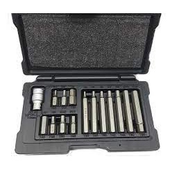 JOGO DE BITS SPLINE ESTRELADO - Marca: Stels; - Referência: 11312; - Material: Aço Cromo Vanádio 50-53 HRc; - Haste Sextavada: 10mm; - 5 Bits Hexagonais de 30 mm: M5, M6, M8, M10, M12; - 5 Bits Hexagonais de 75 mm: M5, M6, M8, M10, M12; - 1 Adaptador 1/2" x 10mm; - 1 Maleta.
