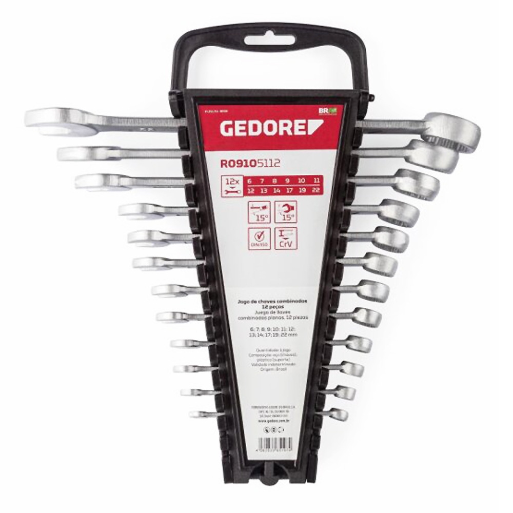 Jogo de Chaves Combinadas com 12 Peças Gedore Características do Produto: - Jogo de chaves combinadas Gedore ideal para aperto e desaperto de porcas e parafusos, manutenções em geral; - As mesmas numerações nos dois lados da chave sendo um lado fixa e o outro lado da chave estrela, proporcionando maior praticidade durante o trabalho; - Possui um encaixe mais preciso da chave ao parafuso ou porca que será apertado assim gerando um conforto maior. Especificações Técnicas: - Código de referência: R09105112; - Código do fabricante: 3300992; - Fornecido em suporte plástico; - Posição da boca: 15°; - Posição da cabeça (Lado estrela): 15°; - Quantidade de peças: 12; - Peso: 1,350 Kg. Itens Inclusos: - Jogo de chaves combinadas, sendo: 6; 7; 8; 9; 10; 11; 12; 13; 14; 17; 19; 22 mm.