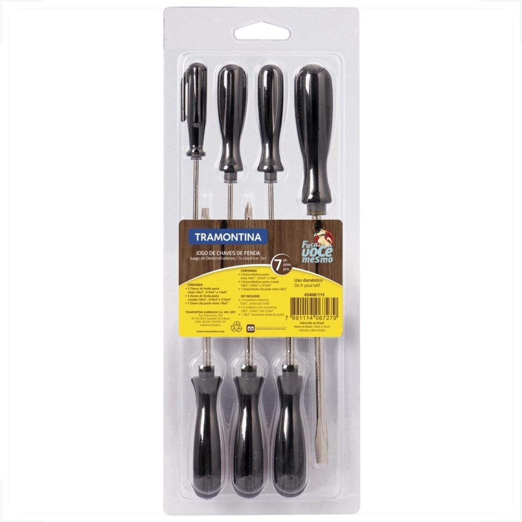 Jogo de Chaves Fenda/Philips Tramontina 7 Peças - 43408115 O Jogo de Chaves Fenda/Philips Tramontina 7 Peças (código 43408115) é uma escolha confiável e versátil para suas necessidades de aperto e desaperto. Composto por chaves de fenda e Philips de diferentes tamanhos, este conjunto oferece praticidade e eficiência em suas tarefas. Seja para trabalhos em casa, no escritório ou na oficina, as chaves, fabricadas pela renomada marca Tramontina, são projetadas para durabilidade e conforto, tornando a manipulação de parafusos e porcas mais fácil e segura. Adicione este conjunto à sua caixa de ferramentas e esteja pronto para enfrentar diversos desafios do dia a dia com precisão e confiança. Especificações Técnicas: • Quer estar sempre preparado para realizar os pequenos trabalhos do lar? • Então você precisar ter o Jogo de Chaves de Fenda Tramontina 7 peças. • Com chaves de ponta cruzada e fenda, apertar ou afrouxar parafusos fica muito mais fácil! • As ferramentas são testadas com rigorosos padrões de qualidade e os cabos são injetados com material de alta resistência. Conteúdo da Embalagem: • 01 Jogo de Chaves Fenda/Philips Tramontina 7 Peças - 43408115 • Manual e Certificado de Garantia Importante: • Garantia de 180 Dias. • Valor Kit.