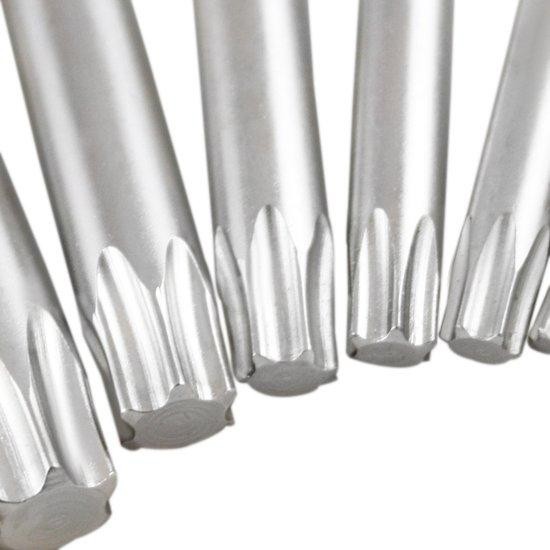 Chave tork tipo "L" extra longo; Material aço cromo-molibdênio-vanádio; Acabamento superficial cromado; Jogo com 9 peças: - T10 / T15 / T20 / T25 / T27 / T30 / T40 / T45 / T50. Marca: KINGTONY