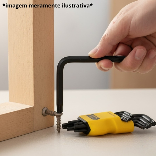 Jogo de Chaves Torque com 9 Peças CRV: - Super prático e resistente ele é composto por 9 peças de diferentes tamanhos; - Conta com corpo em aço cromo vanádio de alta qualidade; - Chaves com formato em L com duas pontas funcionais; - Ótimo acabamento com pintura contra corrosão; - Possui suporte com trava para acondicionamento das chaves diminuindo as chances de perdê-las e facilitando a organização; - Aplicação utilizada na fixação e soltura de parafusos hexalobulares e suas variações; - Resistência e durabilidade, de fácil aplicação e manuseio; - Tamanhos: T10 / T15 / T20 / T25 / T27 / T30 / T40 / T45 / T50 Tamanhos de Chaves Torx e Especificações: T10 Diâmetro da ponta: 2,8 mm Diâmetro externo: 2,05 mm Parafuso compatível: M2.5 Uso comum: Eletrônicos, brinquedos e aplicações leves. T15 Diâmetro da ponta: 3,35 mm Diâmetro externo: 2,4 mm Parafuso compatível: M3 Uso comum: Equipamentos eletrônicos, pequenos eletrodomésticos. T20 Diâmetro da ponta: 3,95 mm Diâmetro externo: 2,85 mm Parafuso compatível: M4 Uso comum: Móveis, eletrônicos, e automóveis. T25 Diâmetro da ponta: 4,5 mm Diâmetro externo: 3,25 mm Parafuso compatível: M5 Uso comum: Montagem de móveis, automóveis e eletrodomésticos. T27 Diâmetro da ponta: 4,99 mm Diâmetro externo: 4,05 mm Parafuso compatível: M6 Uso comum: Móveis de grande porte, eletrodomésticos. T30 Diâmetro da ponta: 5,6 mm Diâmetro externo: 4,05 mm Parafuso compatível: M6 Uso comum: Veículos, maquinário pesado, e estruturas metálicas. T40 Diâmetro da ponta: 6,75 mm Diâmetro externo: 4,85 mm Parafuso compatível: M8 Uso comum: Equipamentos industriais, automóveis. T45 Diâmetro da ponta: 7,93 mm Diâmetro externo: 5,64 mm Parafuso compatível: M10 Uso comum: Maquinário pesado, construção civil. T50 Diâmetro da ponta: 8,95 mm Diâmetro externo: 6,45 mm Parafuso compatível: M12 Uso comum: Construção, montagem de grandes estruturas. Dicas de Uso: Verifique o Parafuso: Sempre verifique o tamanho do parafuso antes de escolher a chave, para garantir um encaixe adequado e evitar danos ao parafuso ou à chave. Mantenha a Chave Limpa: A sujeira e a gordura podem prejudicar o encaixe. Limpe a chave e a área do parafuso antes de usar. Use o Torque Adequado: Ao apertar ou soltar parafusos, use a força adequada para evitar danificar a cabeça do parafuso ou a chave. Marca: - Fertak Dimensões: - Altura: 3cm; - Largura: 10,5cm; - Comprimento: 22cm.