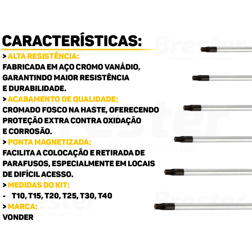 Jogo De Chaves Torx Hexalobular Aço Cromo Vanádio Cabo Reto T10 A T40 Ponta Magnetizada 6 Peças Vonder