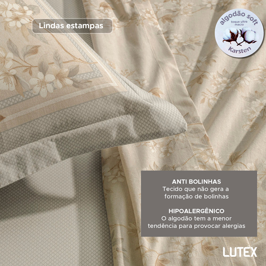 A Karsten pensou com muito carinho em sua linha de cama para tornar o seu momento de sono muito mais aconchegante. _x000d_ _x000d_ O tecido é confeccionado em Percal 200 Fios 100% Algodão, um tecido de trama bem fechada que resulta em toque ultra macio e aconchegante, combinado a sensação de frescor, ideal para o clima brasileiro. _x000d_ _x000d_ A linha de cama Karsten 200 Fios Percal 100% Algodão Dobra Feita tem estampas em cores neutras, que transmitem serenidade e frescor no olhar. Este jogo leva o selo de algodão soft pois é fabricado em um processo inovador de acabamento têxtil e finalizado em calandra, que resulta em conforto que remete a aconchego e tranquilidade, criando um ambiente propício ao descanso e noites revigorantes. _x000d_ _x000d_ Seu design dupla face oferece versatilidade, enquanto o bordo contrastante acrescenta um toque elegante e refinado._x000d_ _x000d_ Esta coleção tem o objetivo de proporcionar composições que transmitam o prazer de viver no seu conforto diário. É a chance de você se inspirar e criar seu próprio cenário afetuoso e colecionar memórias._x000d_ _x000d_ O PURO ALGODÃO_x000d_ _x000d_ O Algodão Soft é feito com 100% Algodão e oferece diversos benefícios como o toque macio, suave e conforto térmico. Além disso, o acabamento em calandra dobra o tecido ao mesmo tempo que aquece as fibras o deixando mais fofo e com leve brilho que tornam as peças impecáveis._x000d_ _x000d_ A linha de cama Karsten da LUTEX é resultado da combinação entre matéria-prima nobre, tecnologia e beleza nos detalhes que garantem encantamento à primeira vista._x000d_ _x000d_ _x000d_ =================================_x000d_ CONTÉM NA EMBALAGEM_x000d_ _x000d_ - 1 Colcha Queen Karsten Percal 200 Fios - 2,40 x 2,60 cm_x000d_ - 2 Porta Travesseiros com Abas - 50 x 70 cm