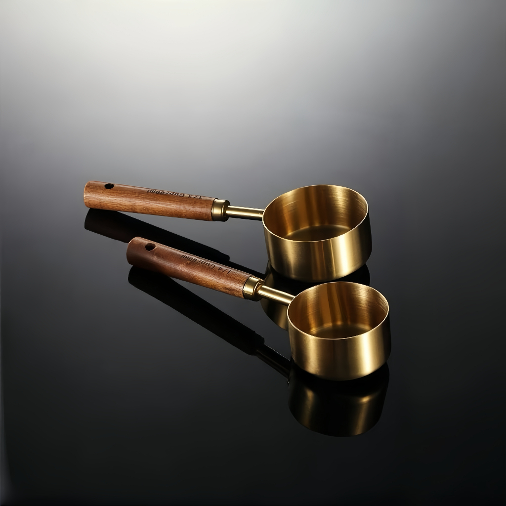 Jogo de Colheres e Copos Medidores em Aço Inoxidável com Cabo de Madeira – Dourado Luxo para Cozinha