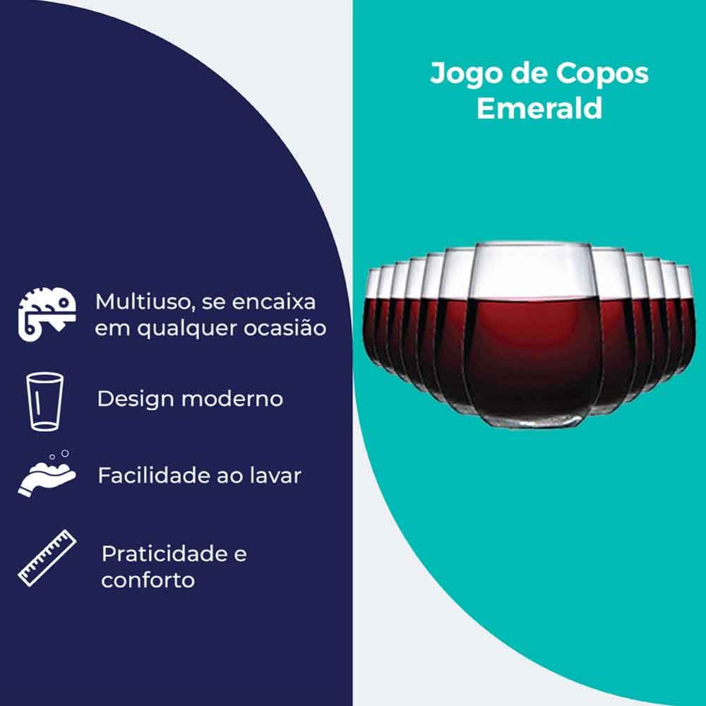 O Copo de Vidro Emerald é um modelo stemless moderno e minimalista, conhecido por sua estabilidade, praticidade e aparência contemporânea. Com bojo semelhante às taças de vinho, mas sem haste, ele une elegância e conforto, tornando cada gole uma experiência sofisticada. Com capacidade de 500ml, o Jogo de Copos de Vidro Emerald, composto por 12 peças, é versátil e ideal para servir vinhos, água, sucos, refrigerantes ou vitaminas. Além de funcional, é uma excelente opção de presente, combinando estilo e praticidade para surpreender amigos e familiares. Uso: Vinhos, Água, Sucos, Refrigerantes ou Vitaminas. Material: Vidro. Capacidade: 500ml. Diâmetro: 89mm. Altura: 113mm. Conteúdo da Embalagem: 12 Peças. - Peça medida com o volume máximo até a boca - Diâmetro é medido pela largura maior da peça. - Pode sofrer variação de até 10% de seu volume. Dica de uso e preservação: • Recomendamos que a limpeza da peça seja feita a mão para evitar quebras ou danos. • Limpe a sujeira utilizando uma esponja macia, tire o resíduo de sabão e seque bem. • Não utilize abrasivos ou utensílios pontiagudos. • Evite impactos e não exponha o vidro a mudanças bruscas de temperatura pois poderá causar choque térmico e danificar seu produto. • Para realçar ainda mais o brilho da peça, limpe-a com uma flanela que não solte fiapos, levemente umedecida com álcool.