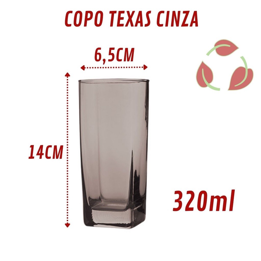 Jogo de Copo Vidro Texas 320ml Quadrado Cinza Agua - 6Un