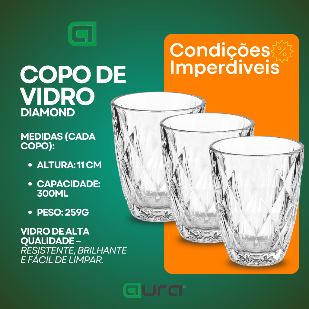 Jogo de Copos 6 Unidades Diamond 300ml Vidro Grosso Luxo
