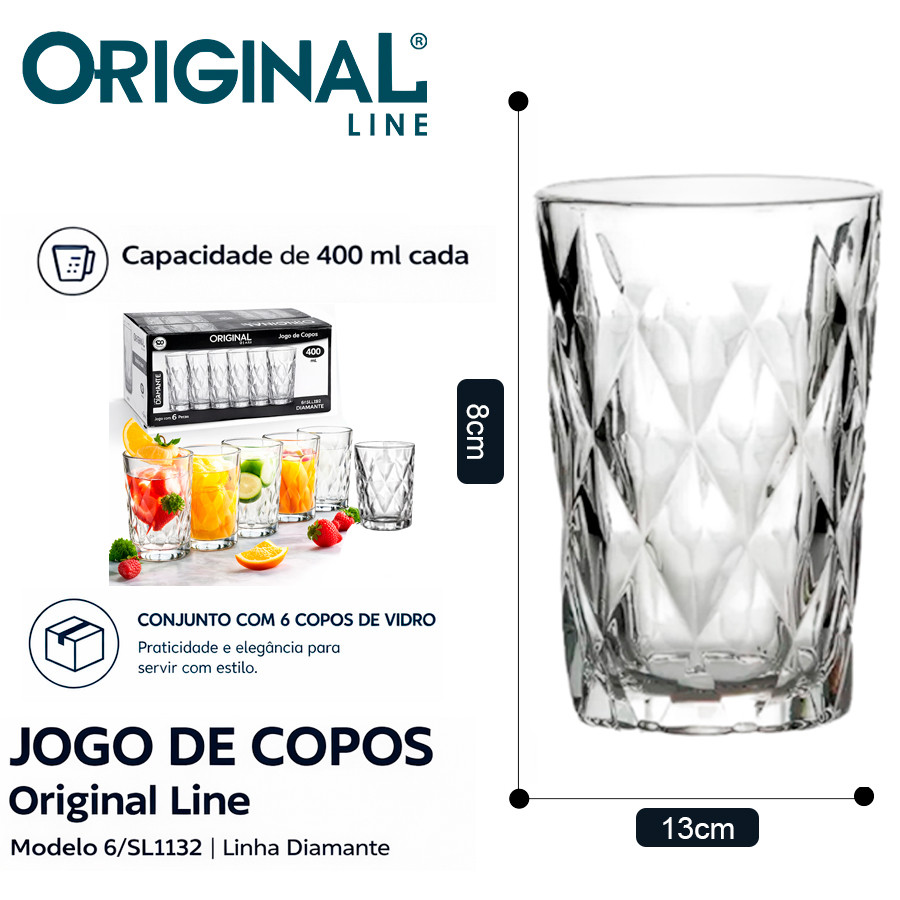 Jogo de Copos Linha Diamante 400ml Original Line Vidro 6unid Descrição Comercial O Jogo de Copos Diamante Original Line 400ml com 6 unidades é a escolha ideal para quem busca elegância e versatilidade no dia a dia. Com design sofisticado em relevo estilo diamante, os copos valorizam a apresentação das bebidas, trazendo um toque moderno e refinado para a mesa. Fabricados em vidro transparente resistente, possuem maior capacidade de 400ml, sendo perfeitos para servir água, sucos, refrigerantes e drinks com gelo, garantindo praticidade tanto no uso diário quanto em ocasiões especiais. O relevo externo proporciona melhor firmeza ao segurar, além de um visual diferenciado. Com excelente acabamento e ótimo custo-benefício, esse conjunto é ideal para quem deseja unir beleza, funcionalidade e durabilidade em um único produto. Características: - Conjunto com 6 copos de vidro - Capacidade de 400 ml cada - Linha Diamante Original Line - Design texturizado em relevo (estilo diamante) - Material vidro transparente - Estrutura resistente e durável - Formato ergonômico com melhor pegada - Ideal para água, sucos, refrigerantes e drinks Benefícios: - Maior capacidade para bebidas com gelo - Design sofisticado que valoriza a mesa - Textura que melhora a firmeza ao segurar - Versátil para diferentes tipos de bebidas - Vidro resistente para uso diário - Excelente custo-benefício em conjunto com 6 peças Orientações de Uso: -Lave antes do primeiro uso -Utilize esponja macia e sabão neutro -Evite choques térmicos e impactos -Não utilize produtos abrasivos -Pode ser levado à lava-louças (uso moderado recomendado) Ficha Técnica: - Marca: Original Line - Tipo de Produto: Copo para bebidas - Linha: Diamante - Código/Modelo: 6/SL1132 - EAN: 7898745132765 - Material: Vidro - Capacidade: 400 ml - Quantidade: 6 unidades - Cor: Transparente - Formato: Cilíndrico com relevo geométrico - Altura aproximada: 12 a 13 cm - Diâmetro aproximado: 8 a 9 cm - Uso indicado: Água, sucos, refrigerantes e drinks - Pode ir à lava-louças: Sim Conteúdo da Embalagem - 06 Copos de Vidro Diamante 400 ml