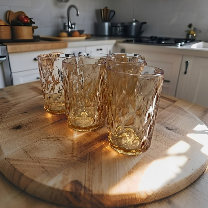 Conjunto de Copos Âmbar 390ml - 6 Peças Dê um toque especial à sua mesa com o Conjunto de Copos Âmbar! Projetado para quem valoriza estilo, funcionalidade e durabilidade, esse conjunto de 6 peças é perfeito para qualquer ocasião, transformando o ato de servir em uma experiência sofisticada e memorável. Com uma capacidade de 390ml cada copo, eles são ideais para servir sucos, água, refrigerantes ou até drinks elaborados. Feitos em vidro resistente, os copos combinam um design moderno com a atemporal elegância da cor âmbar, criando uma atmosfera de requinte e beleza em sua mesa posta. Características do produto: Material: Vidro resistente Cor: Âmbar Capacidade: 390ml (cada copo) Quantidade: 6 copos Design: Moderno e elegante Lavável em lava-louças: Sim 3 Benefícios mais importantes: Elegância atemporal: O tom âmbar e o design refinado tornam qualquer refeição mais especial. Qualidade duradoura: Vidro resistente que garante longa vida útil, mesmo com uso frequente. Praticidade no dia a dia: Laváveis em lava-louças, facilitando a limpeza e manutenção. 5 Opções de uso: Servir sucos frescos no café da manhã. Oferecer água ou refrigerantes em almoços ou jantares. Preparar drinks especiais para festas ou encontros. Decorar mesas temáticas ou sofisticadas com um toque de cor e estilo. Presentear amigos ou familiares com um conjunto elegante e funcional.