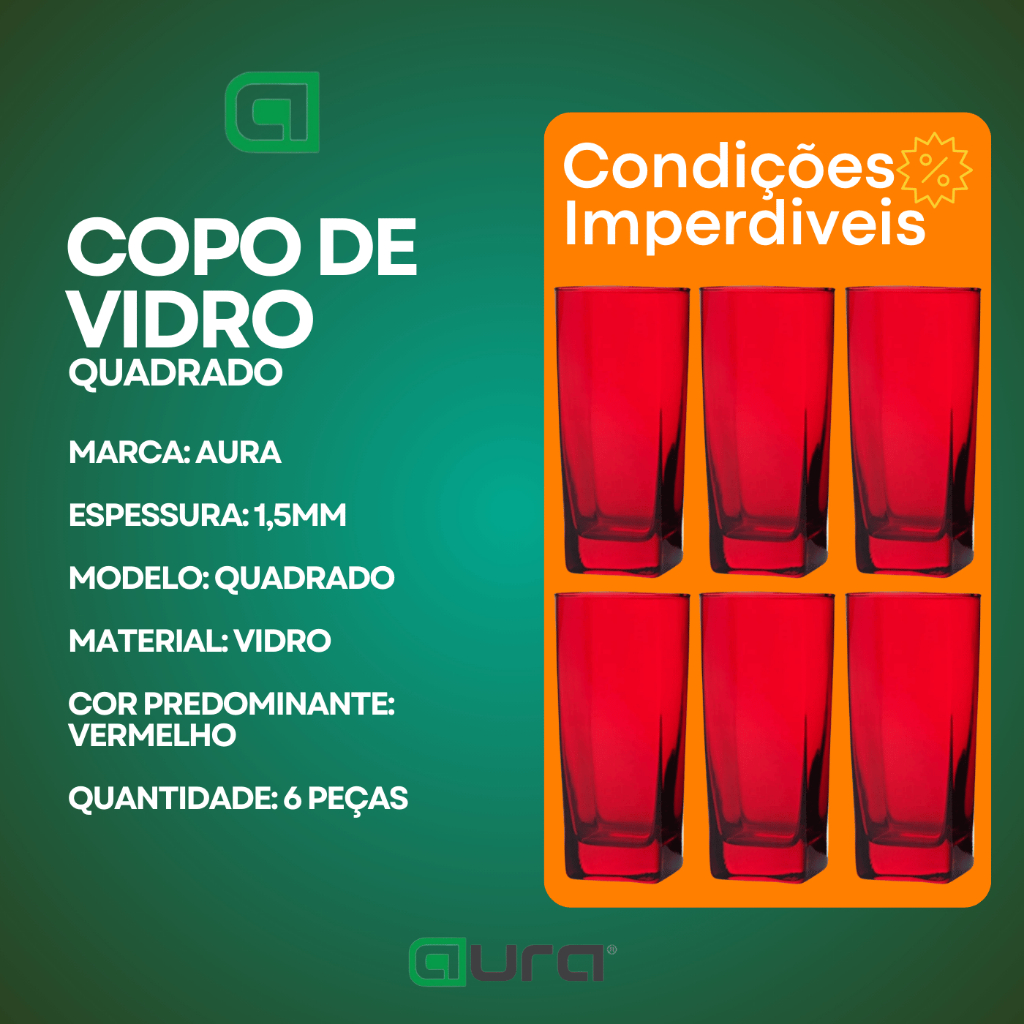 Jogo De Copos Vidro 320ml Bali Quadrado Luxo Vermelho