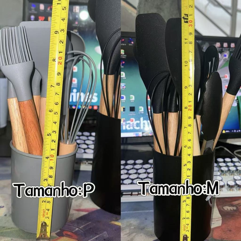 Jogo de Cozinha Kit com 12 Peças de Silicone, Utensílios e Copo Suporte para Cozinha Cabo de Madeira