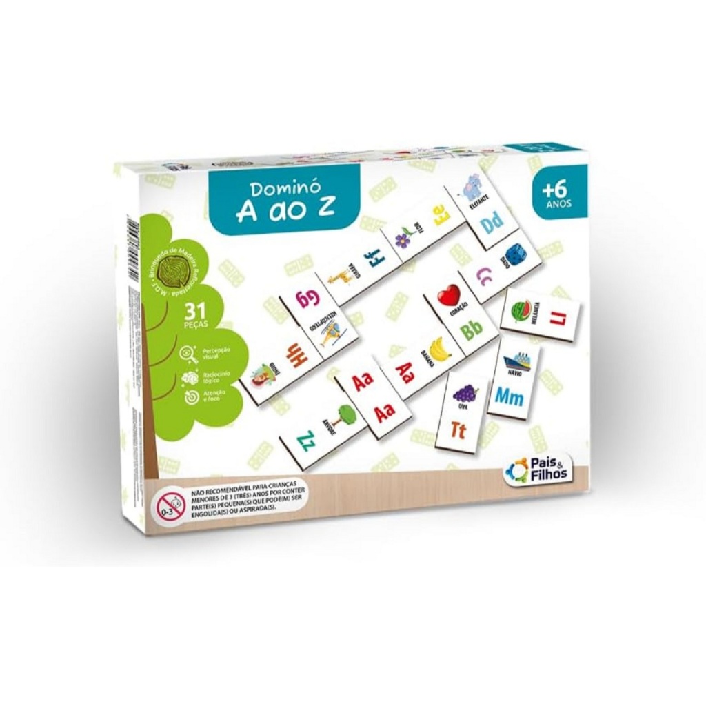 O Jogo Dominó A ao Z 31 Peças é um brinquedo educativo que auxilia no desenvolvimento da coordenação motora e percepção visual da criança. O Jogo Dominó irá proporcionar momentos incríveis de lazer e diversão. • Material: Madeira. • Conteúdo: 31 peças. • Recomendado a partir de 4 anos de idade. • De 2 a 6 jogadores.