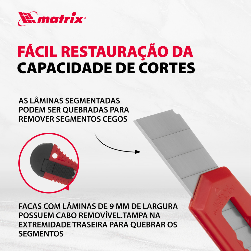 Conjunto MTX 789919: A Solução Completa para Corte e Raspagem O Conjunto MTX 789919 é uma coleção meticulosamente selecionada de ferramentas de alta performance, projetada para atender a todas as suas necessidades de corte e raspagem, seja em reformas, tarefas domésticas ou no escritório. Composto por 4 facas de lâminas retráteis de 9 mm, 2 facas com lâminas de 18 mm e 2 raspadores robustos com lâminas de 40 e 52 mm, este conjunto oferece versatilidade sem igual para cortar papelão, papel, papel de parede e outros materiais macios, além de remover com facilidade tinta seca de superfícies como vidro ou azulejos. Principais Vantagens e Características: Durabilidade e Longevidade: As lâminas, feitas de aço carbono 60 de alta qualidade, são sinônimo de resistência e durabilidade. Este material garante que as ferramentas do conjunto mantenham a eficácia do corte por um longo período, mesmo sob uso intenso. Ajuste Preciso do Comprimento da Lâmina: A funcionalidade de ajuste do comprimento da lâmina, graças ao fixador em cada ferramenta com lâmina retrátil, permite um controle preciso e adaptabilidade a diferentes materiais e espessuras, maximizando a eficiência e a segurança do corte. Recuperação Rápida da Capacidade de Corte: A característica das lâminas segmentadas permite uma manutenção fácil e rápida. Os segmentos podem ser quebrados assim que perderem a nitidez, revelando uma nova seção afiada e pronta para uso, o que prolonga significativamente a vida útil da lâmina sem a necessidade de substituição frequente. Segurança Aprimorada: As facas com lâminas de 9 mm vêm equipadas com uma tampa removível na parte traseira, projetada especificamente para quebrar os segmentos de forma segura e conveniente, minimizando os riscos durante o processo. Transparência na Compra: A embalagem blister do conjunto não apenas protege as ferramentas, mas também permite uma inspeção visual completa antes da compra, garantindo que os clientes saibam exatamente o que estão adquirindo. MTX 789919: Versatilidade e Confiabilidade em Cada Corte e Raspagem O Conjunto MTX 789919 é a escolha perfeita para profissionais e entusiastas do DIY que exigem o melhor em termos de funcionalidade, durabilidade e segurança. Seja preparando superfícies para pintura, realizando cortes precisos em materiais variados ou executando tarefas de manutenção e reparo, este conjunto proporciona as ferramentas necessárias para realizar o trabalho com eficiência e precisão. Com o MTX 789919, você tem a garantia de uma solução completa para suas necessidades de corte e raspagem, respaldada pela qualidade e inovação que a MTX oferece.