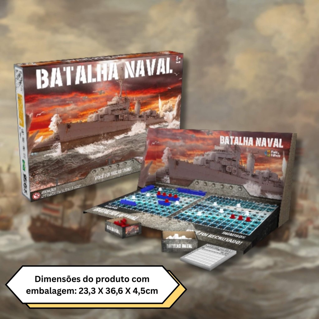 O jogo Batalha Naval foi jeito para toda a família. Os participantes tem como objetivo descobrir através de coordenadas, onde estão localizados os navios adversários. Vence quem afundar totalmente a esquadra inimiga. - Idade: 8 anos+ - Medida Unit.(cm): 36,6 x 23,3 x 4,5 - Peso Unit.(Kg): 0,286 Características: - Marca:PAIS E FILHOS - Modelo:2800-1 *Imagens Meramente Ilustrativas* Conteúdo da Embalagem: - 2 tabuleiros de jogo - 2 tabuleiros divisores - 10 navios (5 azuis e 5 vermelhos) - 34 pinos vermelhos - 140 pinos brancos - 2 blocos de controle