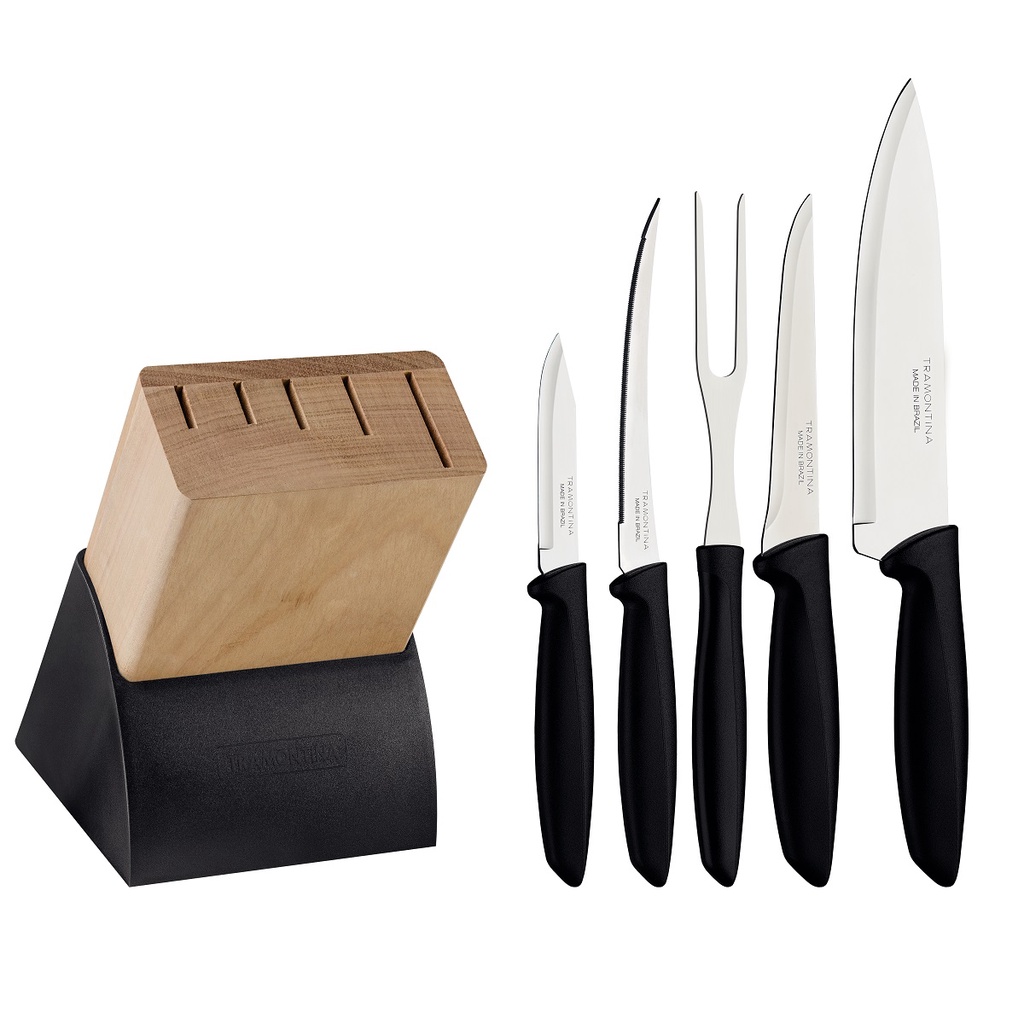 Você vai impressionar seus convidados com o jogo de facas Tramontina Plenus com lâminas em aço inox cabos de polipropileno preto e suporte de madeira 6 peças da linha Plenus. São cinco peças produzidas com cabos na cor preta de polipropileno e lâminas de aço inox, resistentes e fáceis de manusear, podendo ser levadas à máquina de lavar louças. Versáteis e com design moderno, se encaixam em diferentes usos. Podem serem usadas desde preparações mais simples até mais elaboradas. O jogo de facas é a escolha ideal para embelezar ainda mais o seu ambiente! Informações Técnicas: Lâmina de aço inox com maior durabilidade do fio devido ao tratamento térmico. Cabos de polipropileno com maior resistência e durabilidade. Suporte para facas de madeira e polipropileno. Podem ir à máquina de lavar louças facilitando seu dia a dia. Conteúdo: 1 un - Faca Chef 7'' Plenus 1 un - Faca para Desossar 5'' Plenus 1 un - Faca para Legumes e Frutas 3'' Plenus 1 un - Faca para Tomate 5'' Plenus 1 un - Garfo Trinchante Plenus 1 un - Suporte para Facas Recomendações de uso: Antes da primeira utilização, lave bem as peças e seque-as. Produtos cortantes e perfurantes: tenha cuidado ao manusear e mantenha fora do alcance das crianças. Para maior durabilidade dos produtos recomenda-se secar bem antes de guardar, mesmo após lavagem em máquina. Para limpeza do suporte, utilize um pano umedecido em água na área externa e em seguida um pano seco. Para descarte dos produtos e embalagem siga as orientações de reciclagem vigentes. Garantia sobre defeitos de fábrica 30 dias