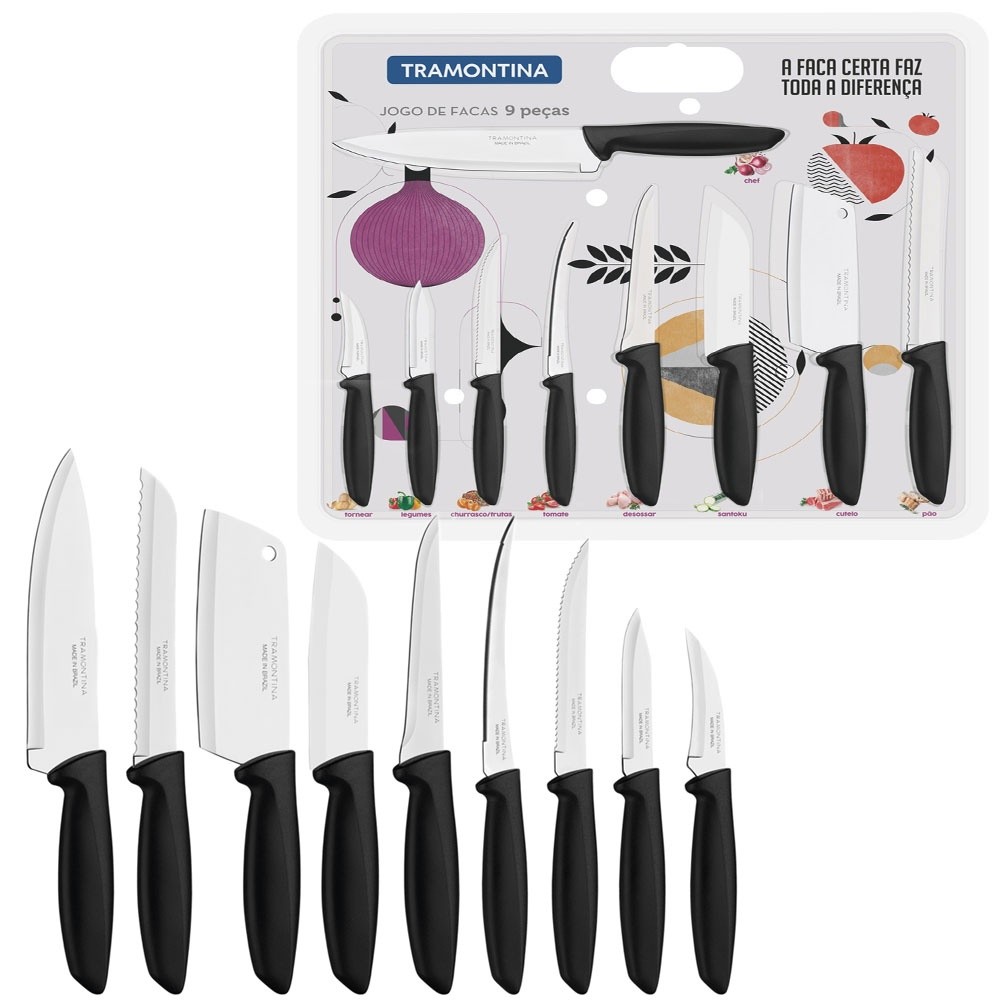 Com o Jogo de Facas Tramontina Plenus com Lâminas em Aço Inox e Cabos de Polipropileno Preto 9 Peças, você terá a solução completa de facas para utilizar nos mais diversos tipos de cortes e ocasiões gastronômicas. As peças combinam com qualquer cozinha e a deixam mais bonita e clássica, pois seus cabos são na elegante cor preta. As lâminas produzidas em aço inox por terem sido submetidas a tratamento térmico, oferecem maior durabilidade e resistência. As facas são fáceis de limpar e podem ser lavadas na máquina de lavar louças. Com peças únicas e de muita importância na cozinha, o jogo de facas é a escolha perfeita para você. Facas de qualidade e beleza você só encontra com a Tramontina! Informações Gerais As lâminas de aço inox tem maior durabilidade do fio devido ao tratamento térmico. Os cabos de polipropileno possuem maior resistência e durabilidade. Podem ir à máquina de lavar louças facilitando seu dia a dia. Recomendações de Uso Antes da primeira utilização, lave bem as peças e seque-as. Produtos cortantes e perfurantes: tenha cuidado ao manusear e mantenha fora do alcance das crianças. Para maior durabilidade dos produtos recomenda-se secar bem antes de guardar, mesmo após lavagem em máquina. Recomenda-se o uso de tábuas de polipropileno ou madeira da Tramontina para maior durabilidade do fio das facas. Não é indicado o uso das facas para o corte de alimentos congelados. Mantenha sempre sua faca afiada utilizando os afiadores da Tramontina. Para descarte dos produtos e embalagens siga as orientações de reciclagem vigentes. Itens Inclusos 1 - Faca para Tornear 3e#39.e#39. 1 - Faca para Legumes 3e#39.e#39. 1 - Faca para Churrasco/Frutas 5e#39.e#39. 1 - Faca para Tomate 5e#39.e#39. 1 - Faca para Desossar 5e#39.e#39. 1 - Faca Santoku 5e#39.e#39. 1 - Faca para Pão 7e#39.e#39. 1 - Faca Chef 7e#39.e#39. 1 - Cutelo 5e#39.e#39.