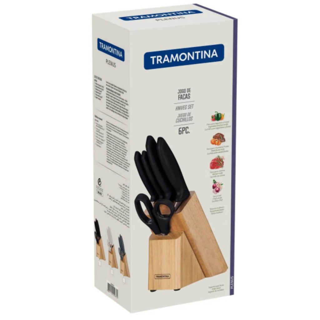Jogo de Facas Tramontina Plenus com Lâminas em Aço Inox Cabos de Polipropileno Preto e Suporte de Madeira 6 Peças Você vai transformar os encontros na sua casa em uma verdadeira experiência com o Jogo de Facas Tramontina Plenus com Lâminas em Aço Inox Cabos de Polipropileno Preto e Suporte de Madeira 6 Peças da Linha Plenus. São as escolhas perfeitas para tornar seus momentos ainda mais incríveis! Características: - Marca: Tramontina - Modelo: 23498015 *Imagem meramente ilustrativa Características principais: - Muito versáteis e modernos, as facas podem ser usados em diferentes momentos, desde o preparo dos alimentos ao serviço de mesa. - As cinco peças possuem cabos na cor preta de polipropileno e lâminas em aço inox, que são resistentes e confortáveis no manuseio. - O elegante suporte de madeira embeleza sua cozinha e ainda organiza as peças. - Podem ser utilizadas na máquina de lavar louças. Especificações: - As lâminas de aço inox têm maior durabilidade do fio devido ao tratamento térmico. - Os cabos de polipropileno possuem maior resistência e durabilidade. - Suporte de madeira. - Podem ir à máquina de lavar louças facilitando seu dia a dia. Recomendações de Uso: - Antes da primeira utilização, lave bem as peças e seque-as. - Tenha cuidado ao manusear produtos cortantes e perfurantes e mantenha-os fora do alcance de crianças. - Para maior durabilidade dos produtos, recomenda-se secar bem antes de guardar, mesmo após lavagem em máquina. - Para descarte dos produtos e embalagens siga as orientações de reciclagem vigentes. Conteúdo da Embalagem: - 1x Suporte de Madeira - 1x Faca para Churrasco/Frutas 5" Plenus - 1x Faca para Legumes e Frutas 3" Plenus - 1x Faca para Cozinha 6" Plenus - 1x Faca Chef 7" Plenus - 1x Tesoura