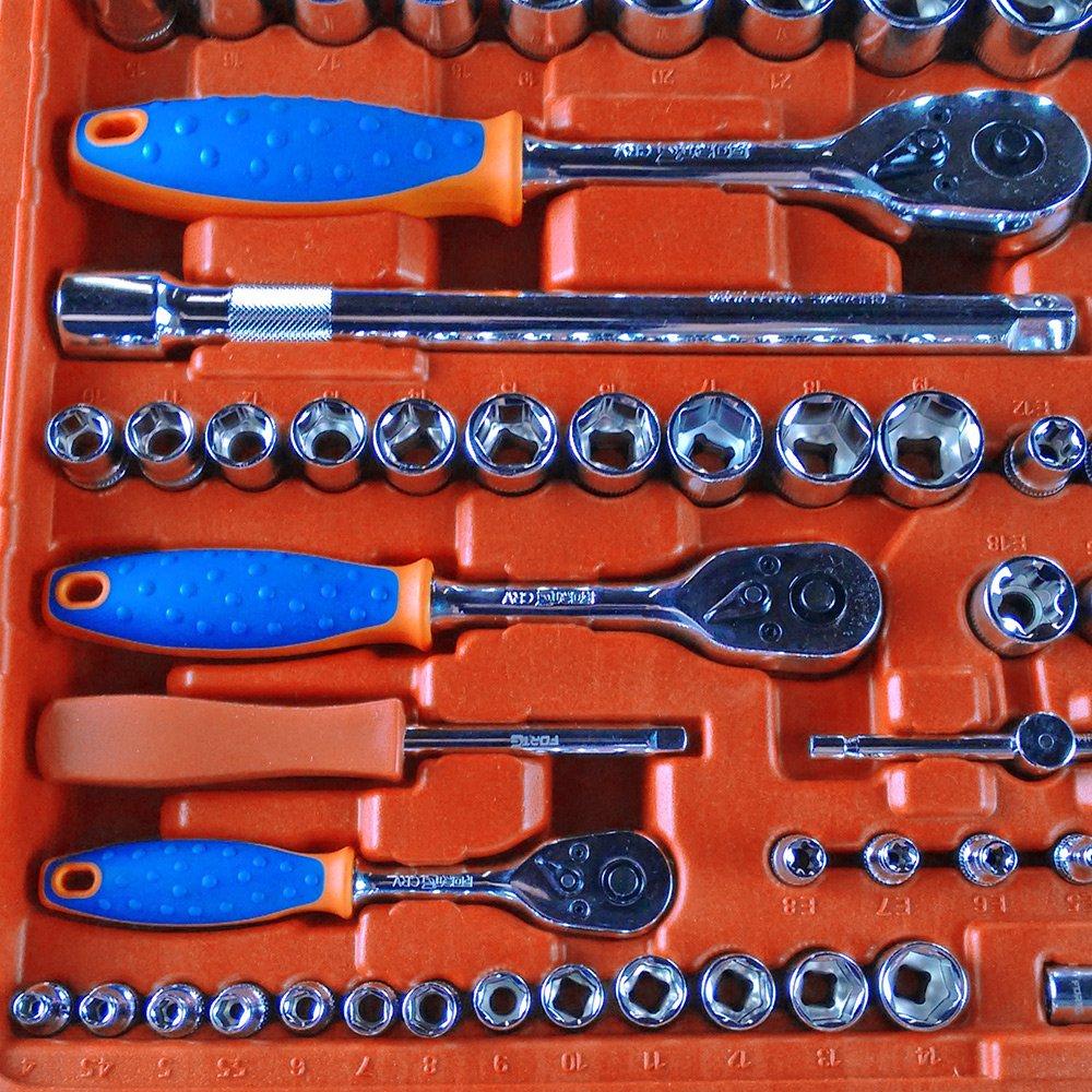 Jogo de ferramentas fabricado em aço cromo vanádio, proporcionando resistência e durabilidade com 178 peças. - Contém: :: Encaixe 1/2 Pol.: - 17 Soquetes sextavados: 10, 11, 12, 13, 14, 15, 16, 17, 18, 19, 20, 21, 22, 24, 27, 30 e 32 mm - 2 Soquetes sextavados longos: 16 e 18 mm - 3 Soquetes sextavados de impacto: 17, 19 e 21 mm - 2 Soquetes para vela: 16 e 21 mm - 2 Soquetes GTX perfil hexalobular: E20 e E24 :: Acessórios: - 1 Extensão 125mm - 1 Extensão 250mm - 1 Chave de catraca reversível 1/2" - 1 Corpo para cabo T - 1 Junta universal - 1 Adaptador para bits :: Encaixe 1/4 Pol.: - 13 Soquetes sextavados: 4, 4.5, 5, 5.5, 6, 7, 8, 9, 10, 11, 12, 13 e 14 mm - 7 Soquetes sextavados longos: 4, 5, 6, 7, 8, 9 e 10 mm - 5 Soquetes GTX: E4, E5, E6, E7 e E8 - 4 Chaves soquetes hexagonais: 3, 4, 5 e 6 mm - 6 Chaves soquetes fenda cruzada: PH0, PH1, PH2, PZ0, PZ1, PZ2 - 4 Chaves soquetes fenda simples: 4, 5.5, 6.5 e 7 mm - 4 Chaves soquetes GTX perfil hexalobular: 4, 5.5, 6.5 e 7 mm - 4 Chaves soquetes GTX com guia: 4, 5.5, 6.5 e 7 mm - 3 Chaves soquetes multidentadas XZN: M8, M10 e 312 :: Acessórios: - 1 Extensão 125mm - 1 Extensão 250mm - 1 Catraca reversível 1/4" - 1 Cabo T - 1 Junta universal - 1 Cabo fixo para soquete 1/4" :: Encaixe 3/8 Pol.: - 10 Soquetes sextavados: 10, 11, 12, 13, 14, 15, 16, 17, 18 e 19 mm - 6 Soquetes sextavados longos: 10, 11, 12, 13, 14 e 15 mm - 1 Soquete para vela: 18 mm - 6 Soquetes hexagonais perfil hexalobular: E10, E11, E12, E14, E16 e E18 :: Acessórios: - 1 Extensão 125mm - 1 Catraca reversível 3/8" - 1 Corpo para cabo T - 1 Junta universal - 1 Adaptador para bits :: Encaixe 5/16 Pol.: - 5 Bits hexagonais: 7, 8, 10, 12 e 14 mm - 4 Bits fenda cruzada: PH3, PH4, PZ3 e PZ4 - 3 Bits fenda simples: 8, 10 e 12 mm - 6 Bits GTX perfil hexalobular: T40, T45, T50, T55, T60 e T70 - 6 Bits GTX com guia: T40, T45, T50, T55, T60 e T70 :: Conjunto de chaves: - 9 Chaves L hexagonais abauladas: 1.5, 2, 2.5, 3, 4, 5, 6, 8 e 10mm (CRV) - 9 Chaves L GTX perfil hexalobular: T10, T15, T20, T25, T27, T30, T40, T45 e T50 (CRV) - 12 Chaves combinadas com catraca: 8, 9, 10, 11, 12, 13, 14, 15, 16, 17, 18 e 19 mm (CRV) :: 1 Maleta - Garantia: 6 meses Ref.: FORTGPRO-FG8955 Marca.: FORTGPRO