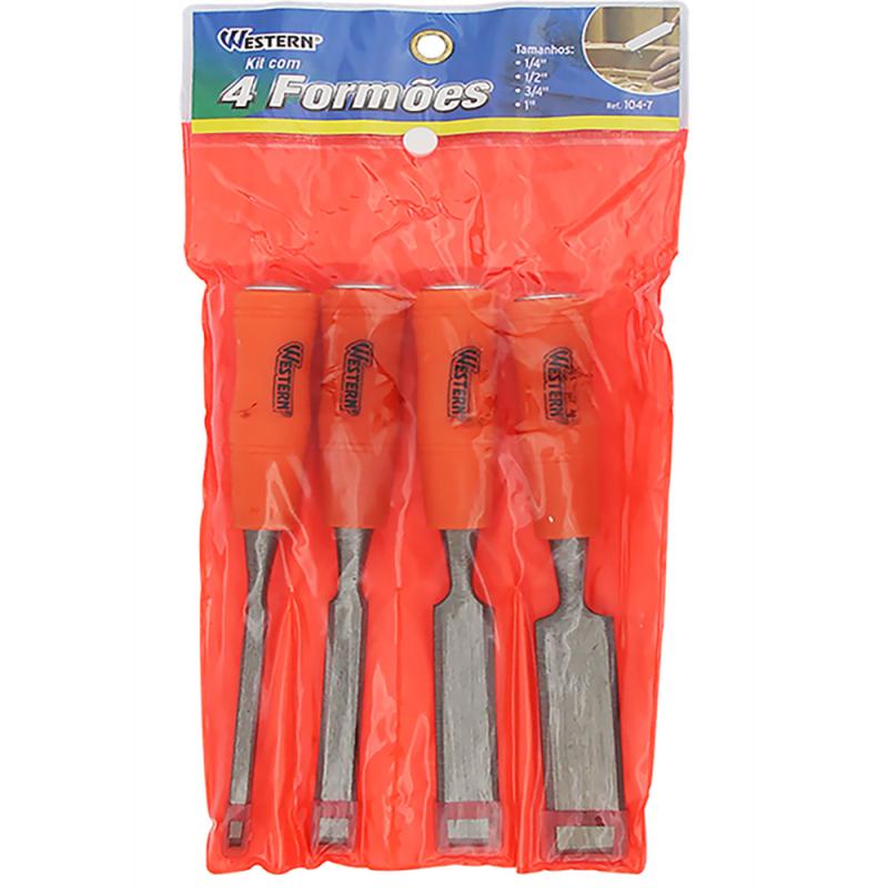 Jogo de Formões com 4 Peças 104-7 WESTERN DADOS TÉCNICOS:Dimensões das Peças:1/4"1/2"3/4"1" Material: PP, Ferro.Cor: Cabo laranja. Garantia: 3 MesesMarca: Western.Ref: 104-7*Imagens meramente ilustrativas.