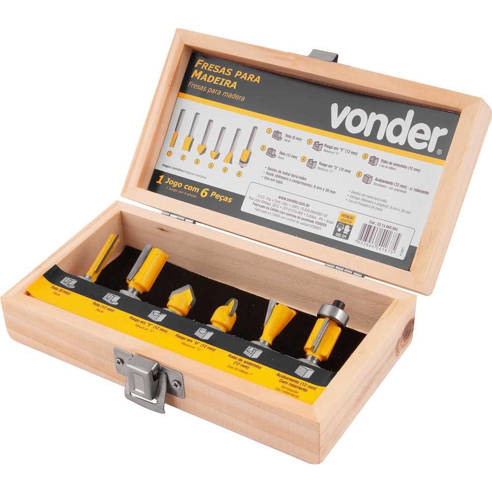 Jogo de fresas para madeira com 6 peças VONDER Fresas com dentes de metal duro, conferindo maior durabilidade. Indicado para trabalhos em madeiras e derivados. Especificações Técnicas: Diâmetro da haste: 6,0 mm Número de peças do jogo: 6 peças Massa aproximada (peso) (kg): 0,28 kg Conteúdo Da Embalagem: 1 Jogo com 6 peças, sendo: 2 fresas retas 6 mm e 12 mm, 1 fresa para rasgo em V 12 mm, 1 fresa para rasgo em U 12 mm, 1 fresa rabo de andorinha 12 mm e 1 fresa com rolamento para acabamento em lâminas 12 mm.