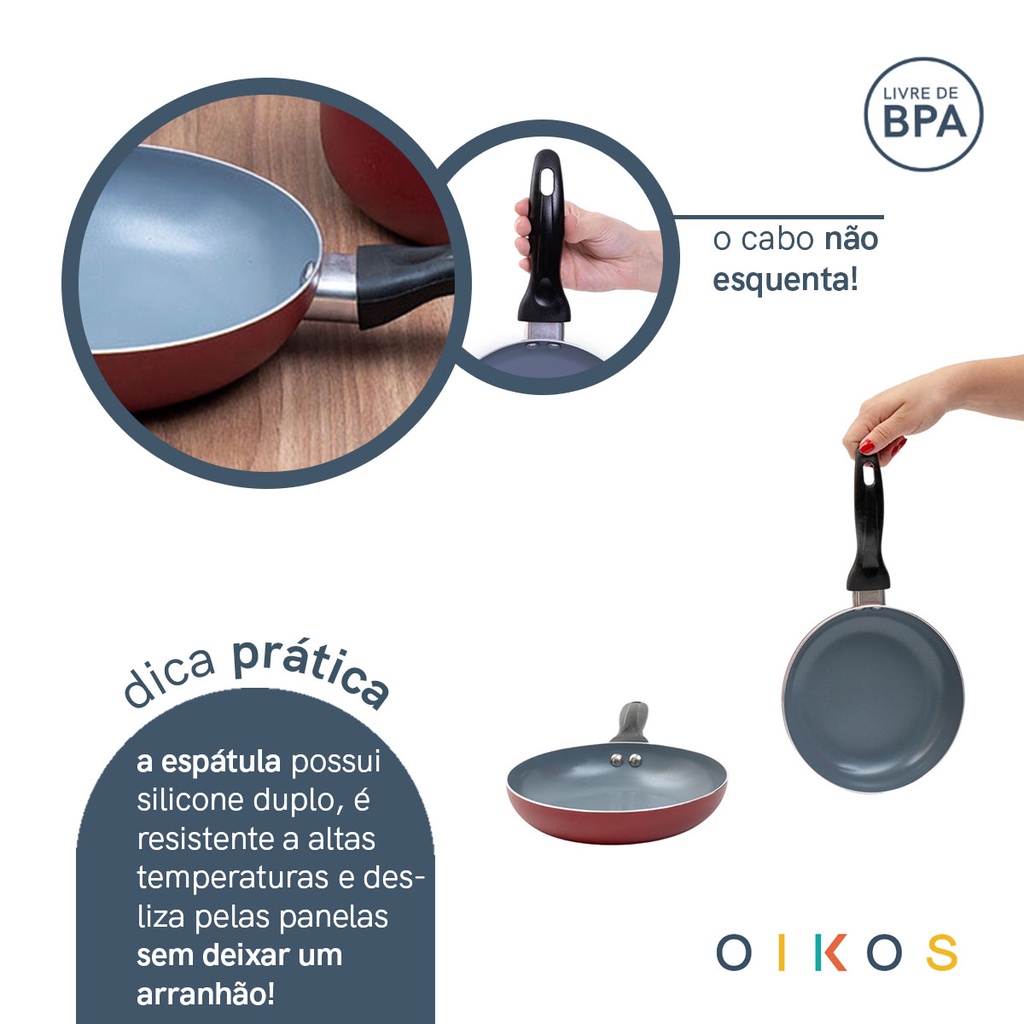 Conheça o kit de 2 frigideiras antiaderentes e espátula de silicone da coleção base da Oikos! antiaderentes, com alta qualidade e design funcional, as frigideiras são ótimas para fazer suas receitas favoritas sem perigo de grudar alimentos ou ingerir substâncias tóxicas. além disso, possuem 5 camadas: antiaderente cerâmico, camada antidesgaste interna, alumínio, camada antidesgaste externa e pintura externa. a espessura é de 2mm: distribui melhor o calor e evita que os alimentos queimem! a espátula possui silicone duplo e desliza pelas frigideiras sem deixar 1 arranhão! as frigideiras são de alumínio, cerâmica e baquelite. a espátula é de silicone. não utilize objetos pontiagudos ou de metal durante o cozimento. para limpar, basta utilizar esponja macia com detergente. as frigideiras funcionam em fogão a gás e fogões elétricos convencionais. não vão em fogão por indução e nem no forno! leve modernidade e praticidade para sua casa! o kit contém: 1 frigideira antiaderente oikos base 18 cm - 0,65L 1 frigideira antiaderente oikos base 20 cm - 0,75L 1 espátula de silicone reta pequena comprimento: 21 cm | largura: 4,2cm | altura: 4cm