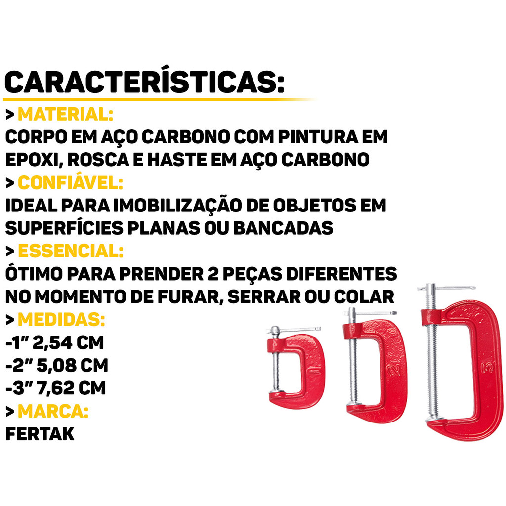 Jogo De Grampos Tipo C Sargento 1 A 3 Polegadas Três Unidades Com Haste Em Aço Carbono
