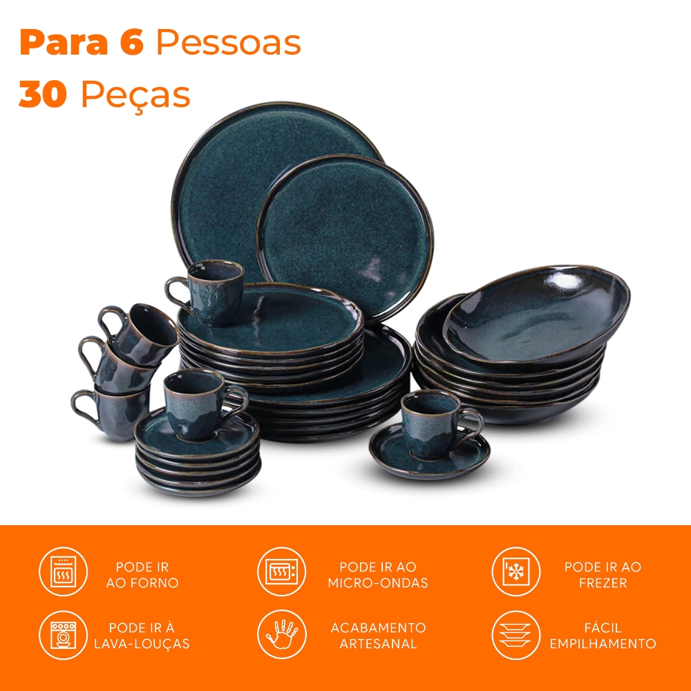 Jogo de Jantar 30 Peças Porto Brasil Oceano Bio Stoneware Transforme suas refeições em momentos especiais com o Aparelho de Jantar 30 Peças da Porto Brasil, que une sofisticação, alta qualidade e resistência incomparável. Fabricado em Stoneware, uma tecnologia inovadora e sustentável, esse conjunto oferece maior durabilidade e baixa porosidade, evitando rachaduras e garantindo peças perfeitas por muitos anos. Com um design moderno e acabamento esmaltado exclusivo, cada peça apresenta detalhes únicos que proporcionam um toque de requinte e exclusividade à sua mesa posta. A textura refinada e as tonalidades elegantes permitem combinações versáteis para qualquer ocasião, desde jantares sofisticados até encontros casuais. Seja para o dia a dia ou para ocasiões especiais, o Aparelho de Jantar Porto Brasil é a escolha perfeita para quem busca qualidade, sofisticação e um toque exclusivo na mesa posta. Adquira já e leve requinte para cada refeição. Composição 30 Peças: 6 Pratos Rasos de Ø27,5cm - Ideais para servir pratos principais com elegância e estilo. 6 Pratos Fundos de Ø22,5cm - Perfeitos para sopas, caldos e massas, trazendo praticidade e sofisticação. 6 Pratos de Sobremesa de Ø21,5cm - O toque final ideal para servir doces e sobremesas. 6 Xícaras de Café de 120mL - Para aquele café especial com muito charme. 6 Pires de Ø13,5cm - Para deixar seu café ainda mais completo. Diferenciais e Benefícios: -Tecnologia Stoneware: Superior às cerâmicas convencionais, garante resistência semelhante à porcelana e acabamento manual exclusivo. -Durabilidade Extrema: Com porosidade inferior a 0,5%, evita absorção de umidade e prolonga a vida útil das peças. -Resistência Térmica: Suporta variações de temperatura de até 180°C, podendo ser levado com segurança ao micro-ondas, forno e freezer. -Segurança Total: Livre de metais pesados, garantindo um uso seguro para toda a família. -Fácil Limpeza: Pode ser lavado manualmente ou na lava-louças. Para remoção de marcas de talheres, recomenda-se o uso de saponáceo. Garantia Porto Brasil: 90 dias contra defeitos de fabricação. 12 meses para gretamento (fissuras na superfície). Características: Marca: Porto Brasil Coleção: Bio Linha: Oceano Referência: 2235311090B01 Material: Stoneware Quantidade: 30 peças Imagens ilustrativas.