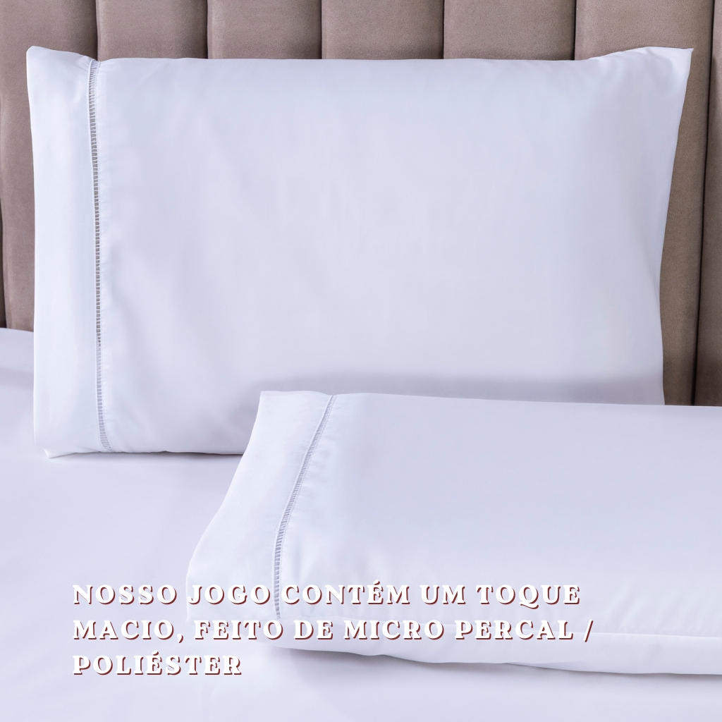 Jogo de Lençol Ponto Palito Micro Percal Transforme seu quarto com o Jogo de Lençol Ponto Palito 100% Poliéster: elegância, conforto e praticidade no dia a dia. Com acabamento refinado e toque suave, une delicadeza, durabilidade e bem-estar para suas noites. Tamanhos : Solteiro: Comprimento: 1,88 M / Altura: 0,30 Cm / Largura: 0,88 M / Com Elástico Em Toda Volta ( 2 Peças ) 1 Fronha Casal: Comprimento: 1,88 M/ /Altura: 0,30 Cm / Largura: 1,38 M / Com Elástico Em Toda Volta ( 3 Peças ) 2 Fronhas Queen: Comprimento: 1,98 M / Altura: 0,30 Cm / Largura: 1,58 M / Com Elástico Em Toda Volta ( 3 Peças ) 2 Fronhas King: Comprimento: 2,03 M / Altura: 0,30 Cm / Largura: 1,93 M / Com Elástico Em Toda Volta ( 3 Peças ) 2 Fronhas Fronhas Medida: 0,70X0,50 Cm Nosso produto CONTÉM 02 PEÇAS, sendo: 01 Lençol De Baixo BERÇO com elástico volta toda medindo 1,30 x 0,70 x 12 cm altura. 01 fronha com medida: (34 X 28 Cm) ( esse modelinho não contém ponto palito ) ✔️ Composição: (100% Poliéster) ✔️ Quantidades de Fios: 400 Fios 🔹Transforme seu quarto com o Jogo de Lençol Ponto Palito 100% Poliéster. Seu acabamento sofisticado em ponto palito traz delicadeza e elegância à decoração, deixando o ambiente mais bonito e acolhedor. 🔹Feito em poliéster de alta qualidade, oferece toque macio e excelente durabilidade, garantindo conforto e praticidade no dia a dia. Ideal para quem busca estilo sem abrir mão do bem-estar. Por que comprar o nosso jogo? Beleza e conforto todos os dias, com praticidade que faz a diferença. ⚠️ Atenção: As tonalidades podem variar de acordo com o lote do tecido e as configurações de tela do dispositivo utilizado no momento da compra. Preparamos o envio em até 24 horas úteis, considerado como envio imediato. Caso deseje alterar a cor do seu pedido, entre em contato conosco pelo chat.