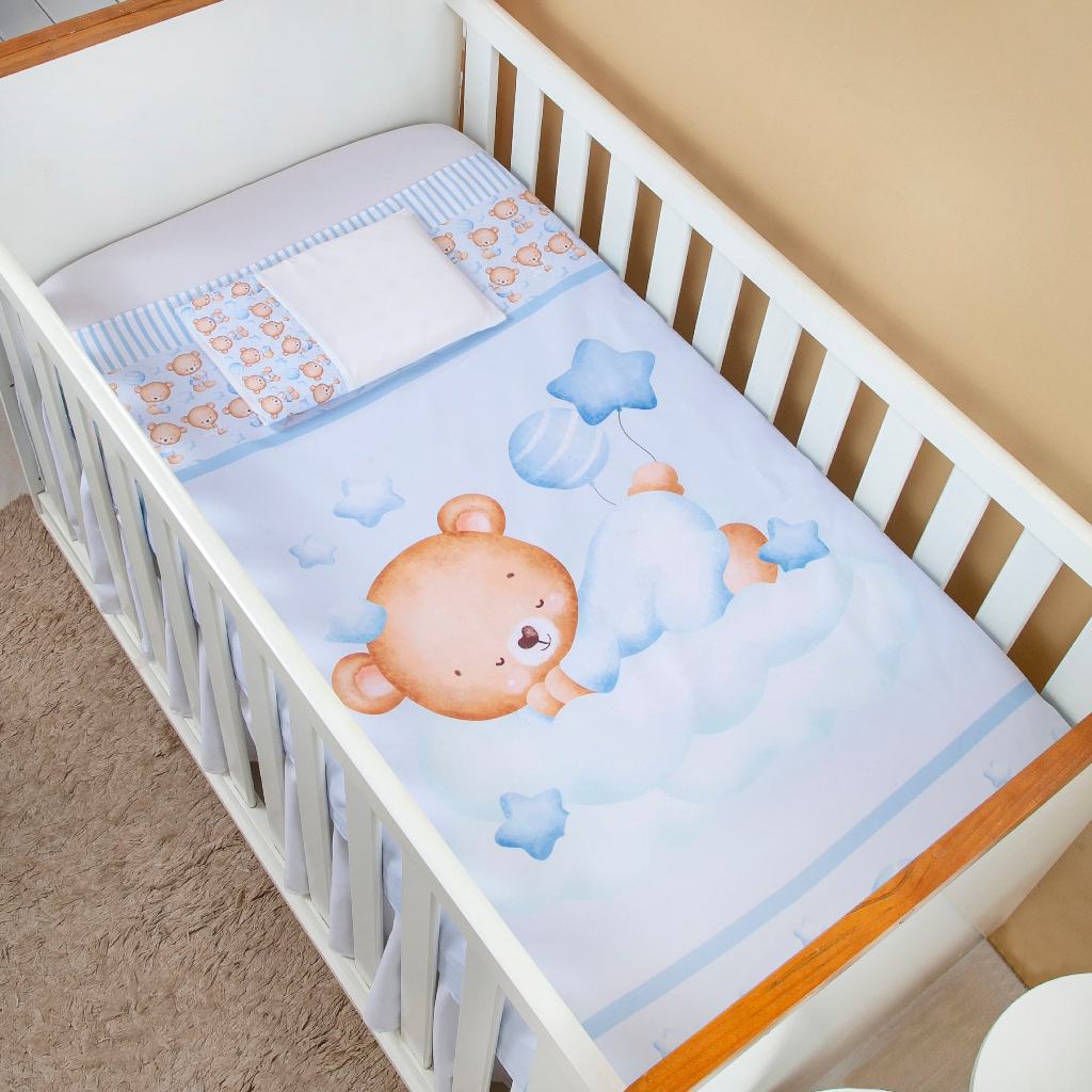 Jogo De Lençol 3 Pçs Berço Americano Bebê Menino Ursinho Azul